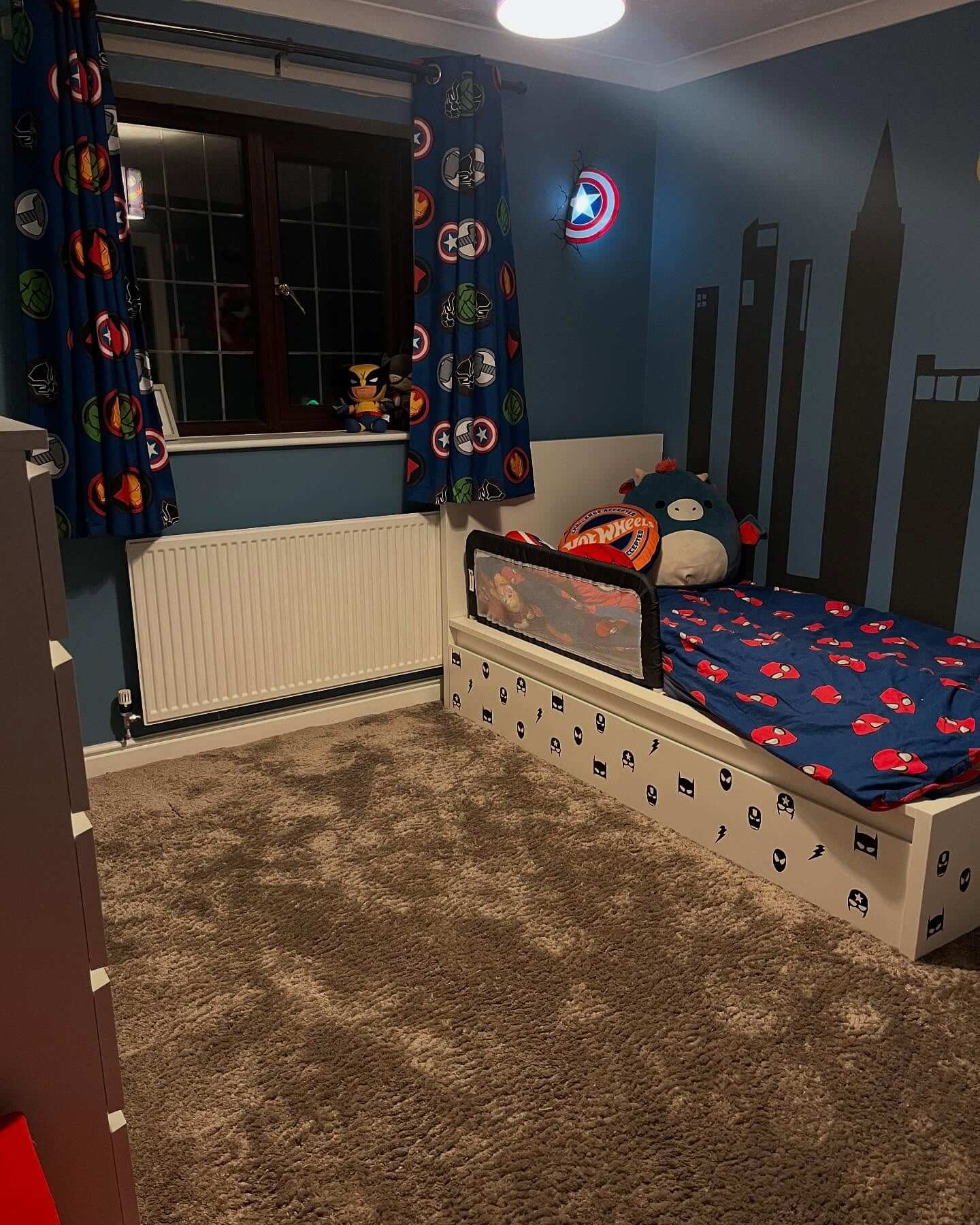 If you want big impact without committing to a full theme, try color-blocked walls paired with a statement rug. Painting the lower two-thirds of the wall in a saturated shade (navy, forest green, terracotta) grounds the room and hides scuffs, while a crisp white or pale neutral up top keeps things bright and airy. Layer in a bold, patterned rug—stripes, geometrics, or checkerboard—to anchor the layout and add energy underfoot. This combo works from toddler to teen because the palette—not characters—sets the tone. Echo your wall color in small doses across bedding, art frames, and storage bins for cohesion. Use washable paint finishes and a rug pad for durability. Add an art ledge or rail so you can swap prints as interests evolve, and keep furniture simple—think a wood bed, a clean-lined dresser, and a task lamp—to let the color and pattern do the heavy lifting. It’s one of the most affordable boys’ bedroom ideas to refresh a space fast, and it scales beautifully in small rooms. Bonus: color blocking can visually raise the ceiling and make the room feel larger.
