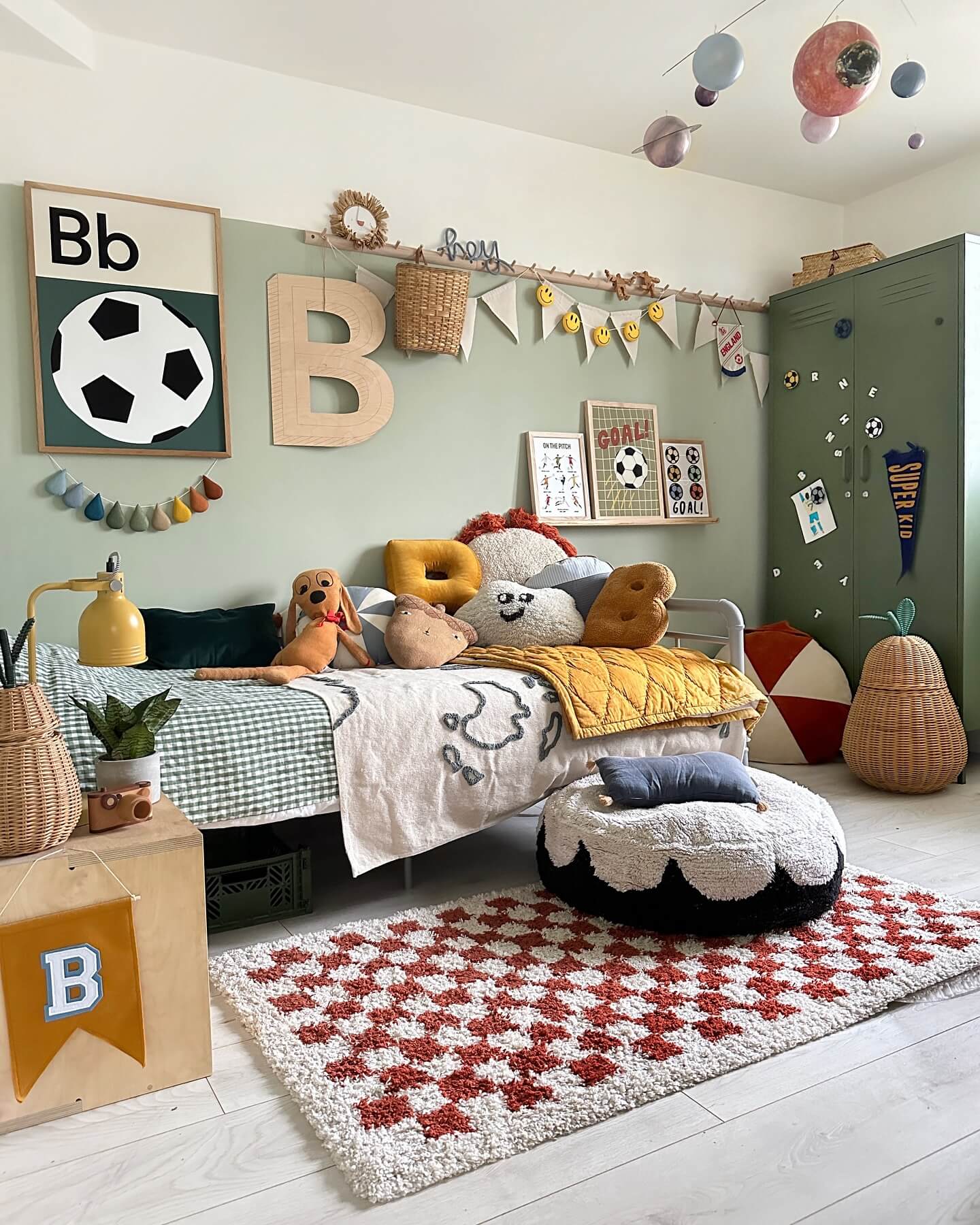 Love sports without locking the room to one team or season. Build a boys’ bedroom on a neutral base—think warm gray walls, natural wood, navy or forest green accents—then layer in athletic energy with easily swappable pieces. Use acrylic frames or jersey rails to display a current favorite without damaging fabrics. Add numbered pillows, stripe tapes on the bed wall, and a compact “ball corral” (deep bin or wire basket) to keep gear contained. A small-scale, low-pile rug nodding to turf texture reads sporty but still refined, and performance fabrics on duvets and beanbags handle sweat, snacks, and sleepovers. For desk zones, a magnetic strip or cork runner corrals brackets, medals, and race bibs while keeping the wall clean. When interests change—from soccer to skate to track—swap art, bedding, and shelf accessories while the room’s core stays timeless. This approach works for toddlers through teens, letting you dial up color for younger kids and pull it back to a minimalist, collegiate vibe later. Functional, flexible, and crowd-pleasing—that’s a win on any scoreboard.