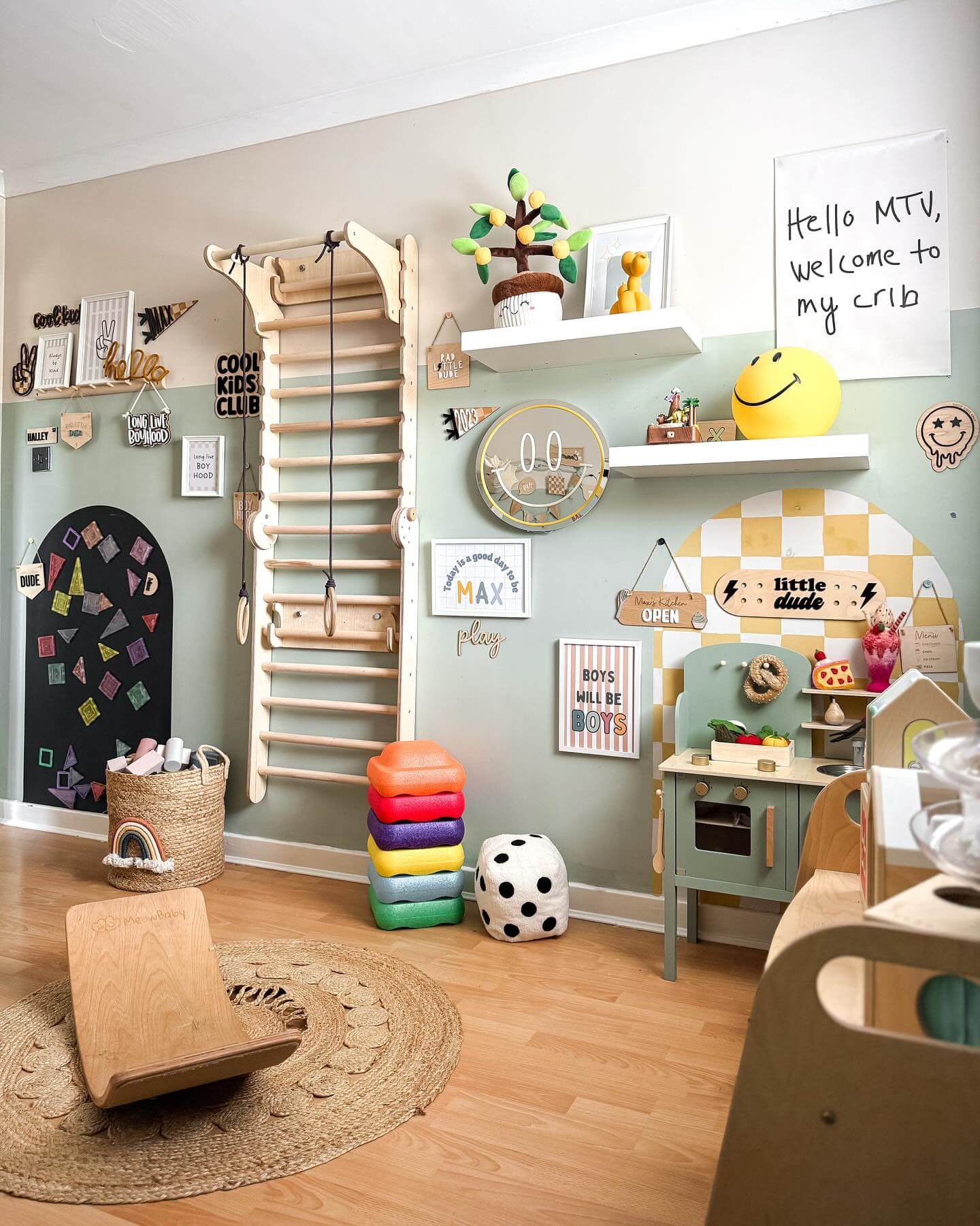 Bring the playground inside with a safe, energy-busting movement zone that suits every stage. For littles, start with low-mounted climbing holds and a gentle angle board; as confidence builds, raise the route and add a rope, Swedish ladder, or doorway bar with gymnastic rings. Teens can use the same setup for grip work and core strength. The nonnegotiables: anchor into studs or use a rated mounting system, choose hardware with published load limits, and finish the floor with 2–3-inch crash mats or layered foam tiles covered by a washable rug. Keep clearances around the wall (and away from windows) and install a dimmable ceiling fixture to avoid glare while climbing. Color-coordinate holds to the room’s palette so the setup feels intentional, not chaotic. A nearby cubby or peg rail can house chalk bags, wraps, and resistance bands. The best part? When playtime is over, the zone stays neat and contained—no giant toys to trip over. In a shared room, movement walls also serve as natural dividers, giving each child a “side” and an outlet for wiggles before wind-down.