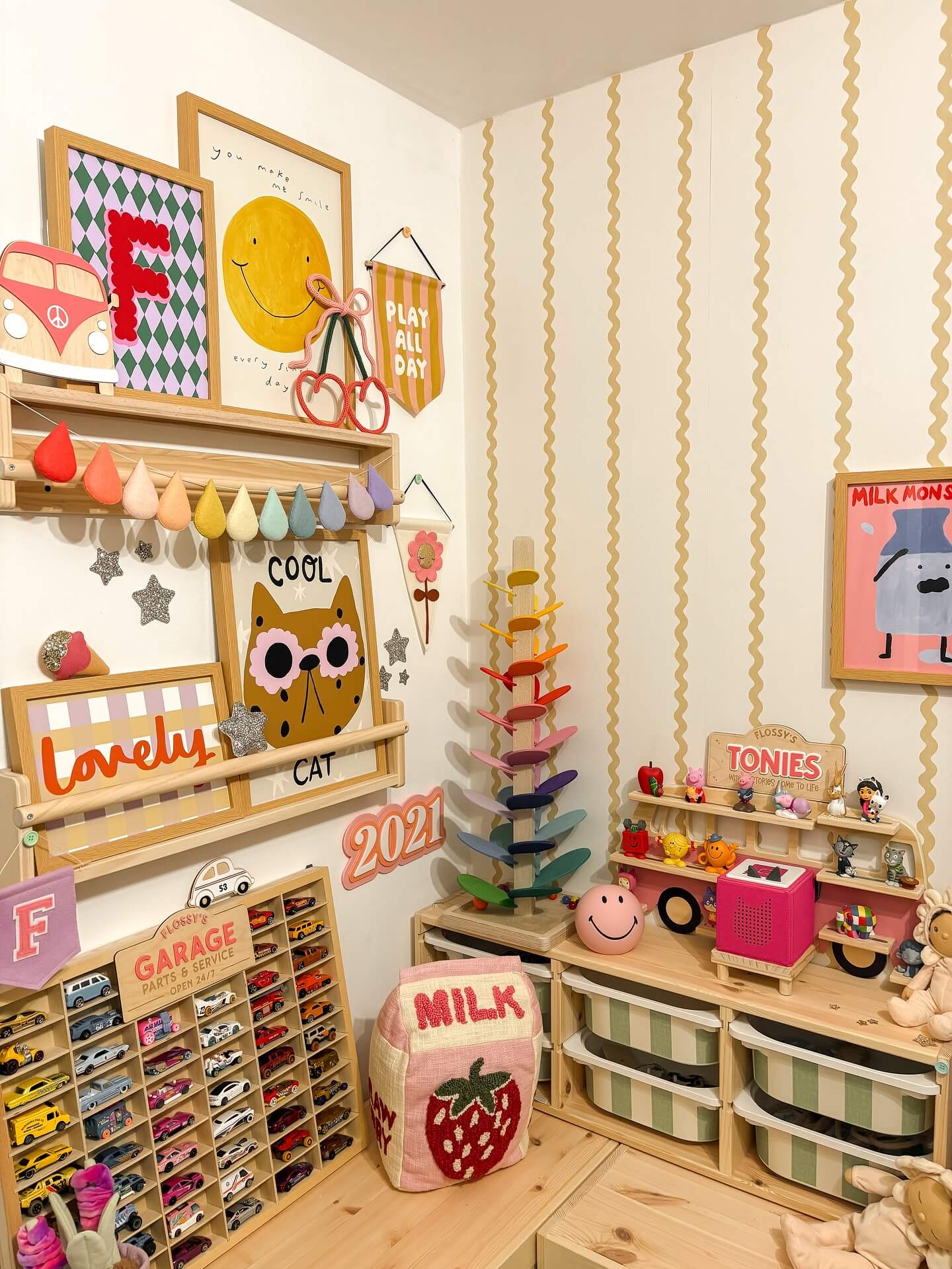 • Design a LEGO zone with baseplate table, rainbow bins, and display ledges, later converting the surface to a drafting desk and the bins to art, coding, or robotics components.