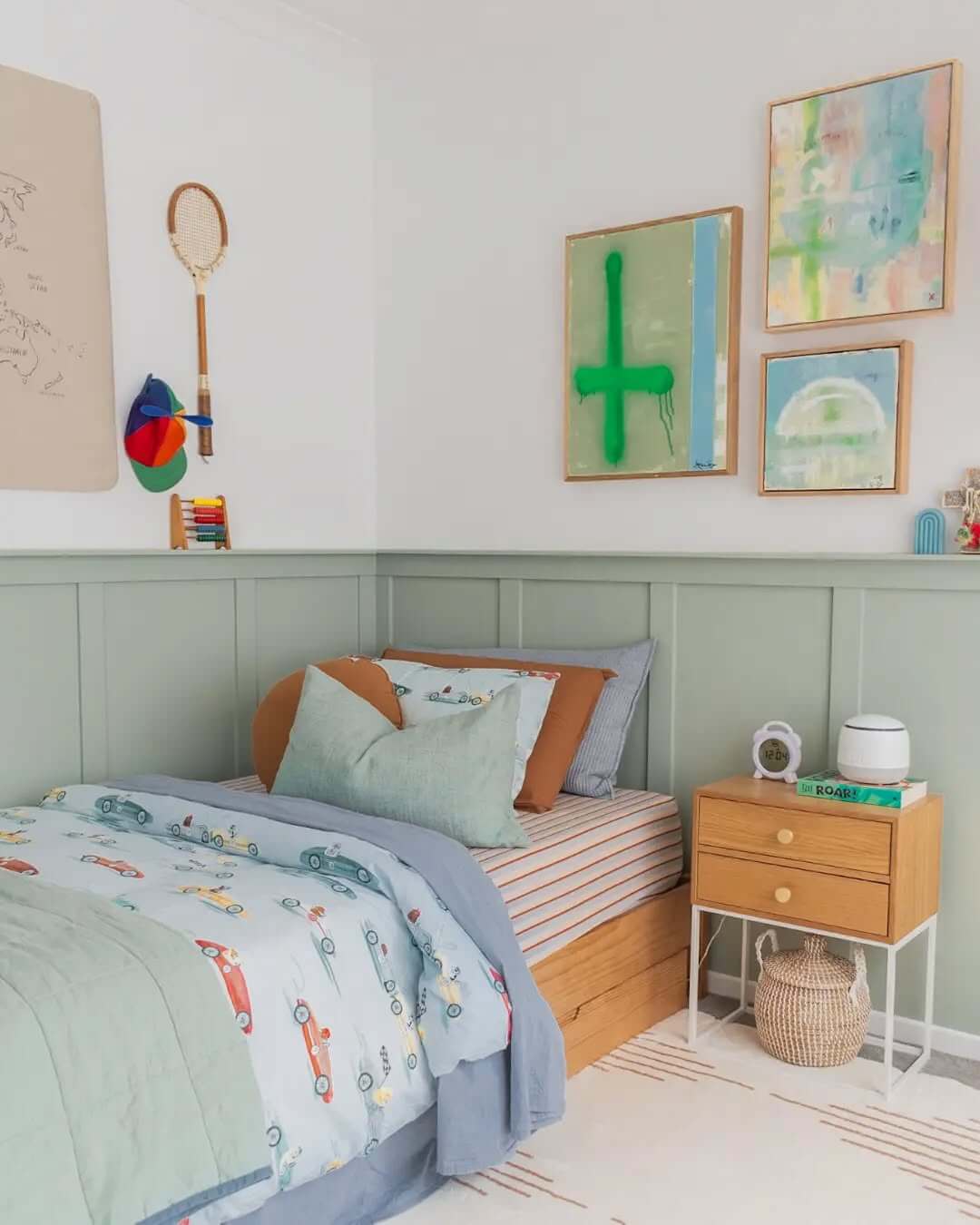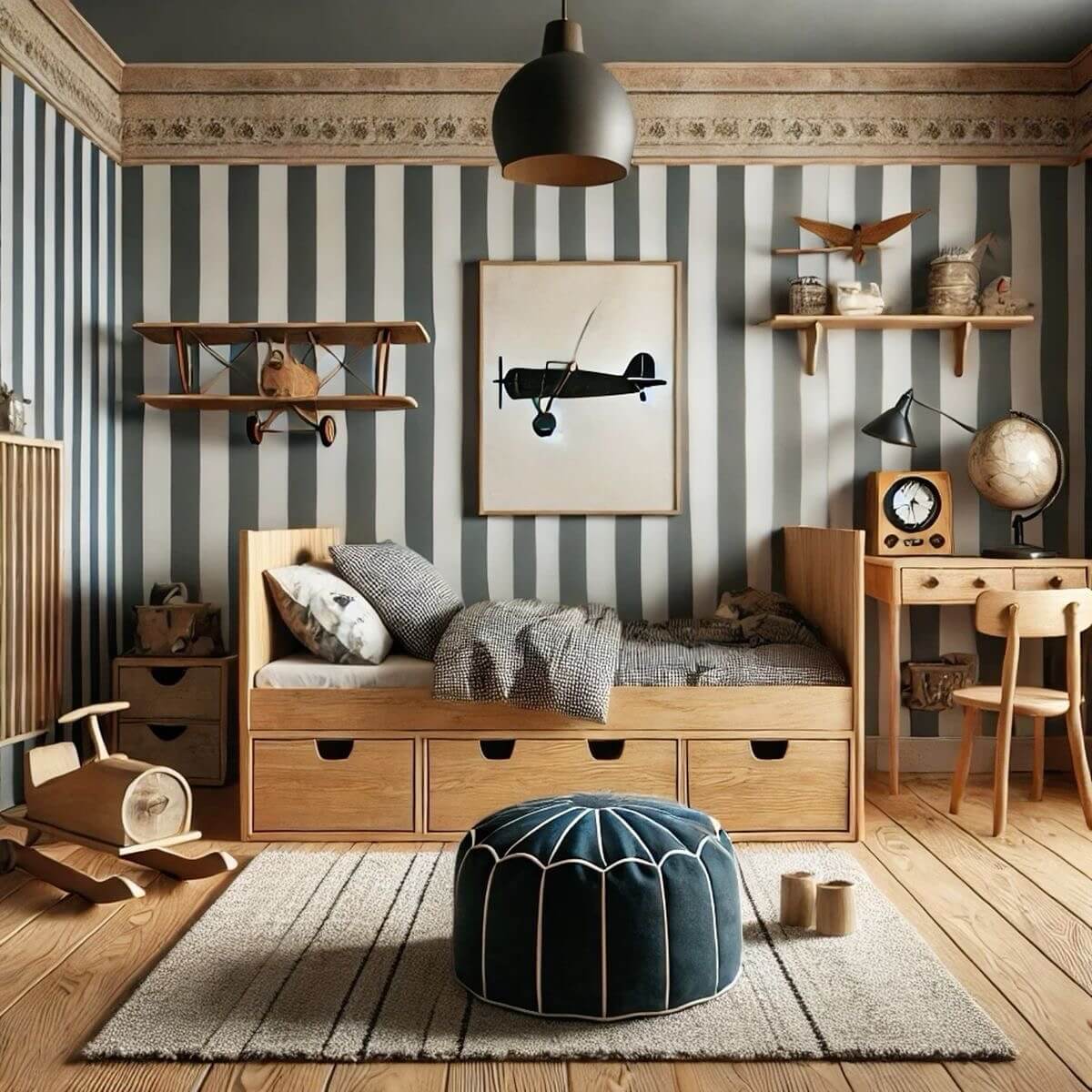 Want pattern without overwhelm? Pair a half-height wainscot (beadboard or simple trim) with patterned wallpaper above. The lower portion takes the bumps and bruises of kid life, and the upper delivers personality—checks, stripes, or subtle geometrics that won’t date quickly. Keep colors tight to your palette so swapping bedding is easy, and repeat one hue in the rug or curtains for cohesion. For renters or commitment-shy parents, use high-quality peel-and-stick paper and paint the trim in a satin finish for wipeability. In small boys’ rooms, vertical patterns visually lift the ceiling; in larger spaces, a bolder motif adds character. Add coordinating hooks along the wainscot rail for everyday backpacks and hats, and finish with framed art that can evolve over time. This classic-meets-modern combo brings texture, protection, and timeless style—ideal for rooms that need to bridge the gap from elementary to early teen years.