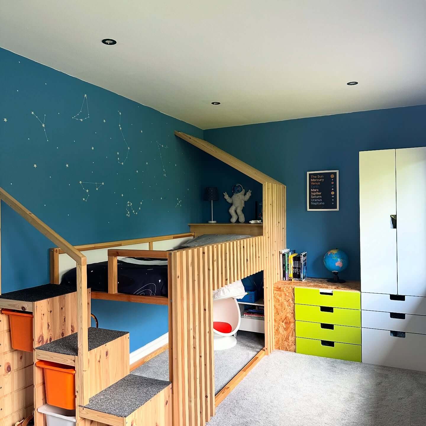 • Launch a space-themed room with constellation decals, glow stars, and a navy accent wall, then upgrade to a telescope stand, NASA posters, and metal shelves for a sleek adolescent vibe.