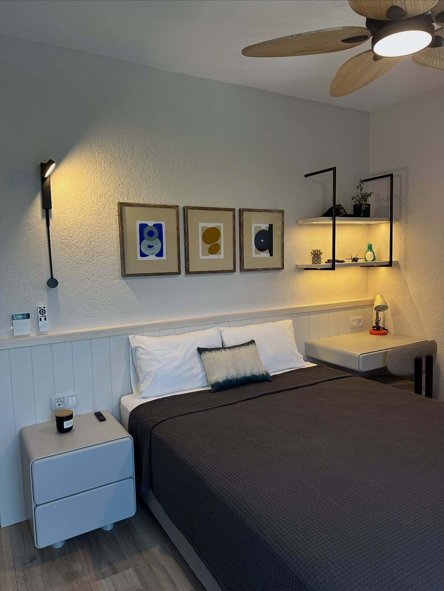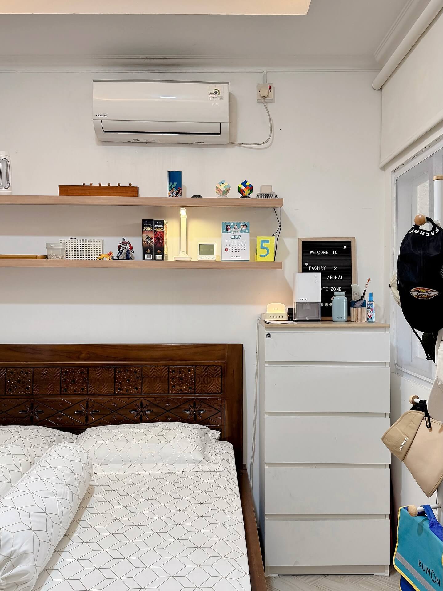 • Floating Nightstand Shelf: Swap bulky nightstands for wall-mounted shelves that hold books, glasses, and chargers, leaving room for a hamper or basket beneath and simplifying vacuuming.