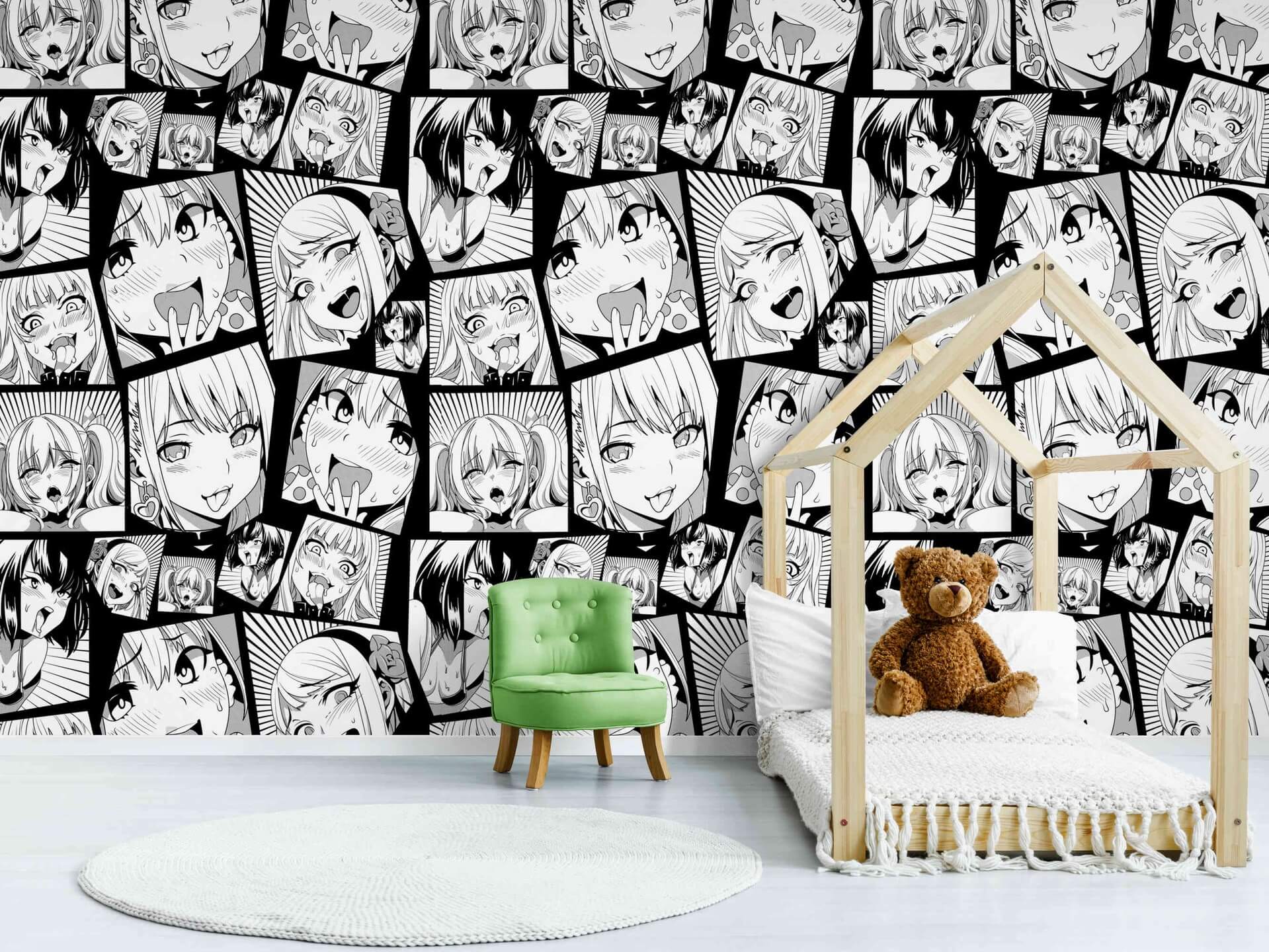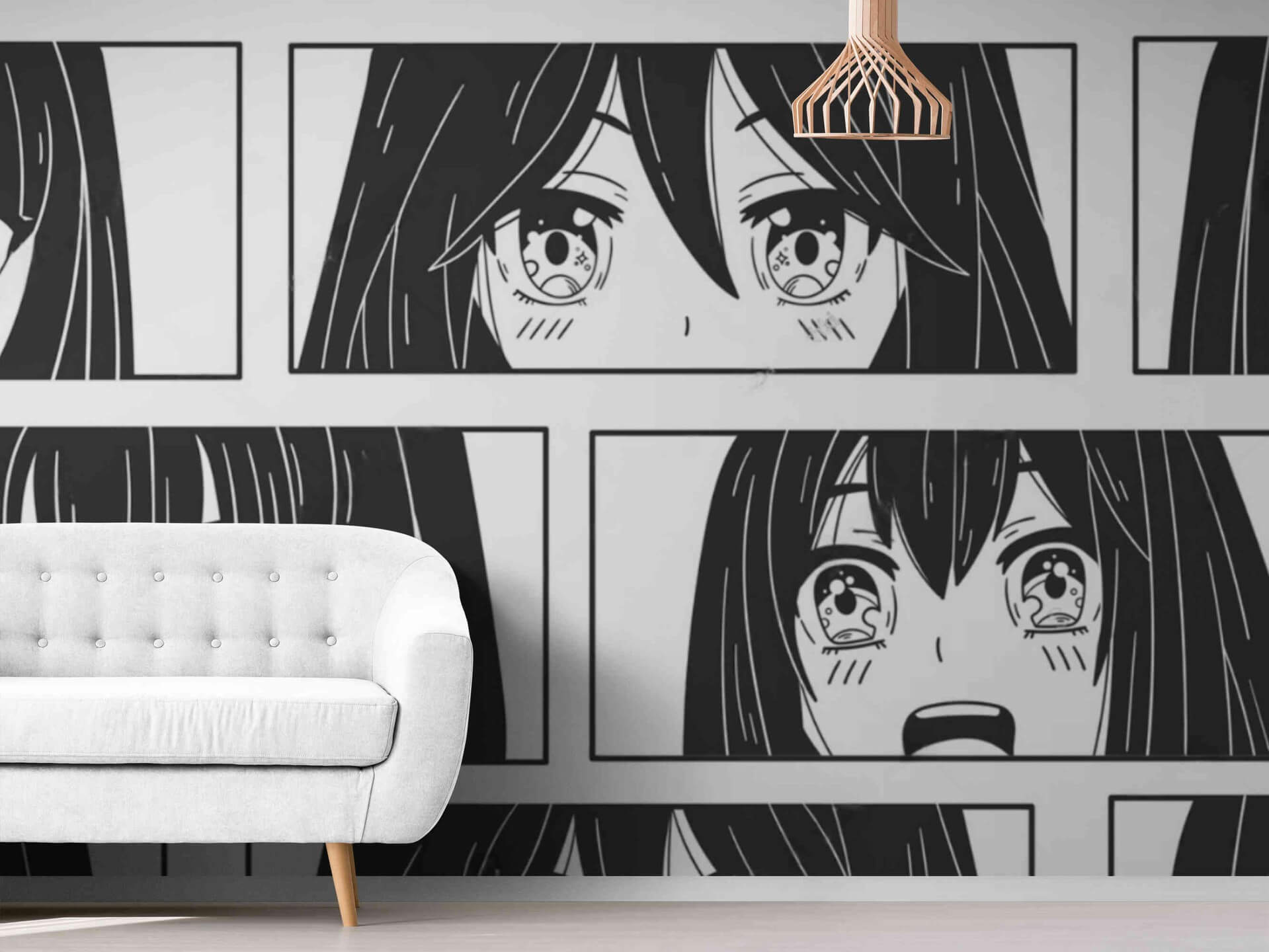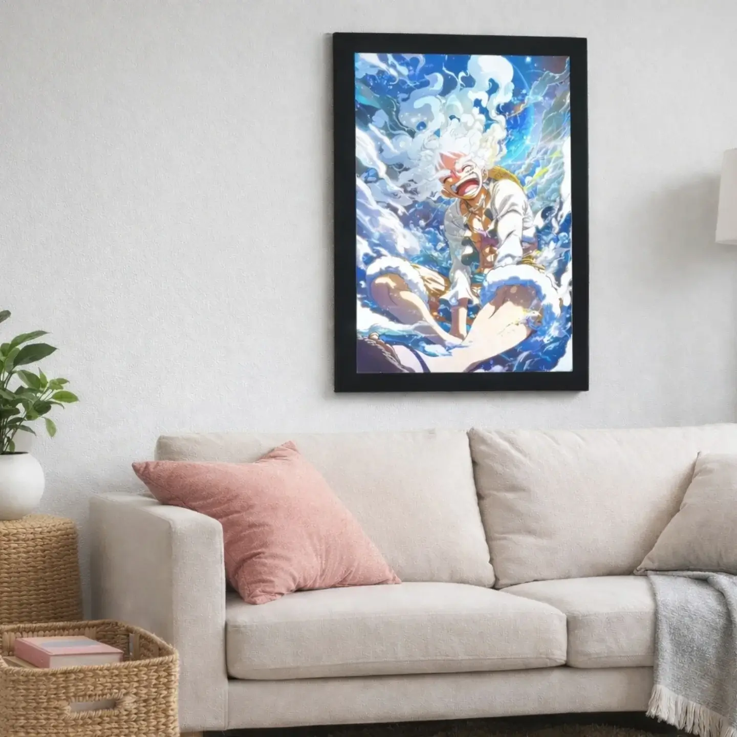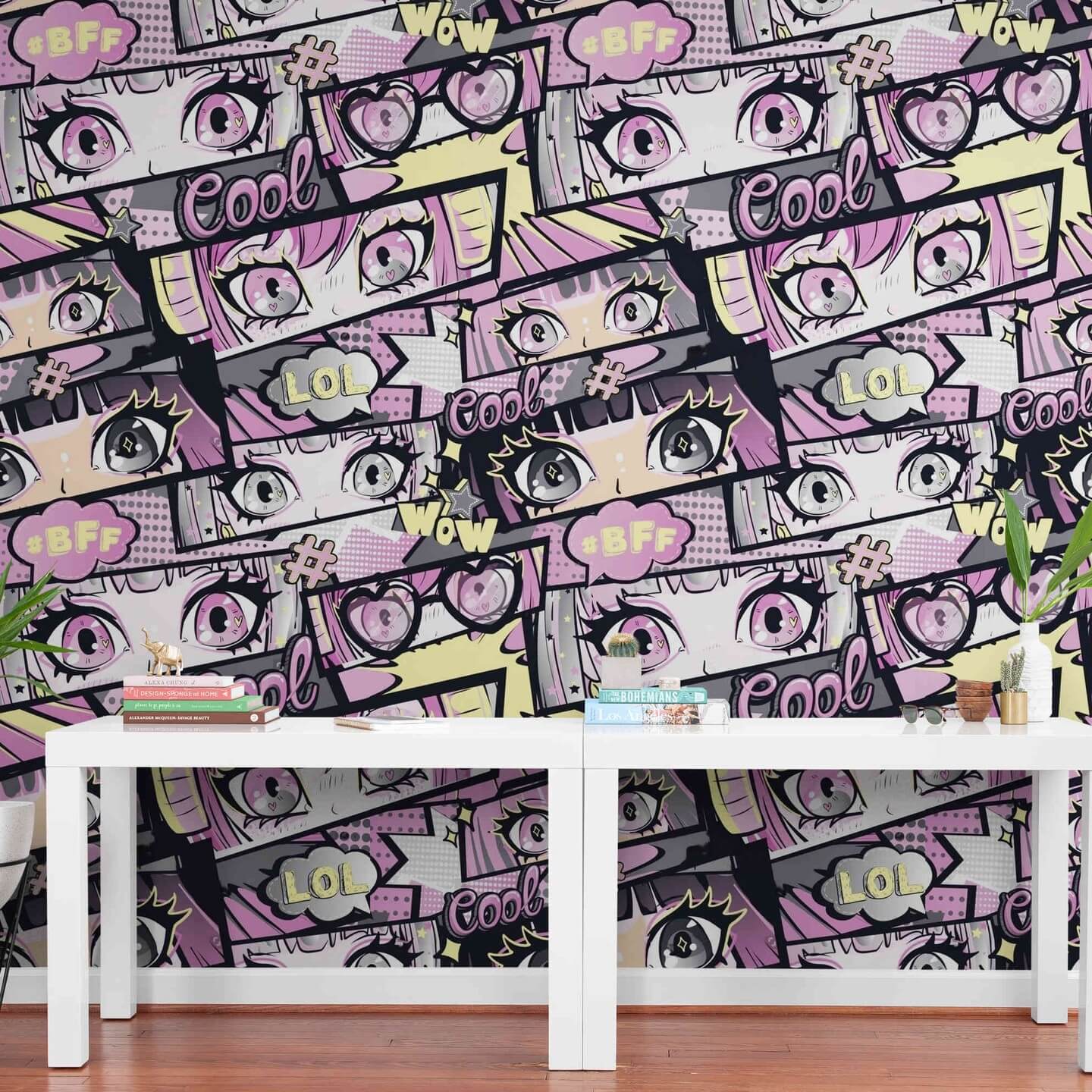 - Monochrome Manga: Crisp black and white with screen-tone grays; mount manga panels, speech-bubble decals, and bold typographic pillows for graphic contrast that photographs beautifully.