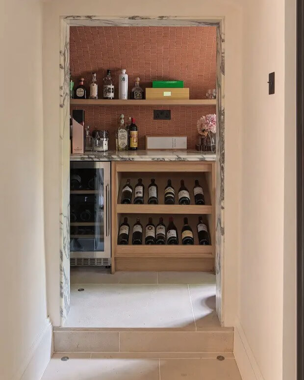 In homes with limited space, creating a functional bar nook can be a challenge. However, the use of vertical space and smart storage options can make even the smallest areas feel luxurious. This particular setup uses a narrow doorway, transforming it into a cozy and sophisticated bar nook. Equipped with a wine rack and compact shelving, it provides ample storage for both spirits and glassware. The use of open shelving against a textured backdrop adds depth while keeping everything easily accessible. The contrasting materials, like marble and wood, lend a touch of elegance without overwhelming the senses. This clever use of a small nook exemplifies how utilizing available space efficiently can result in a chic and inviting bar area.