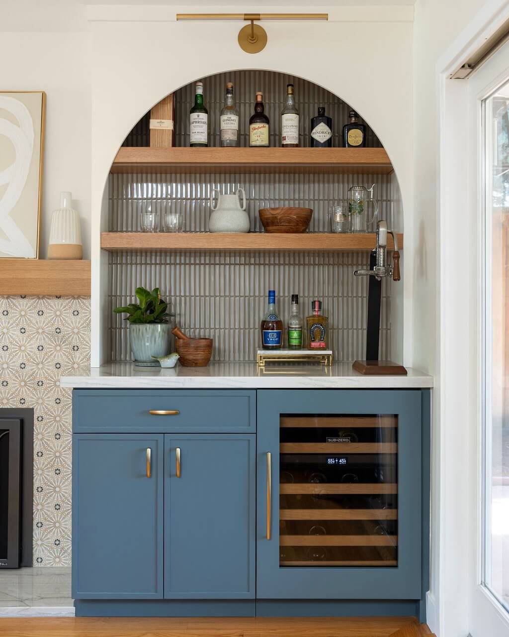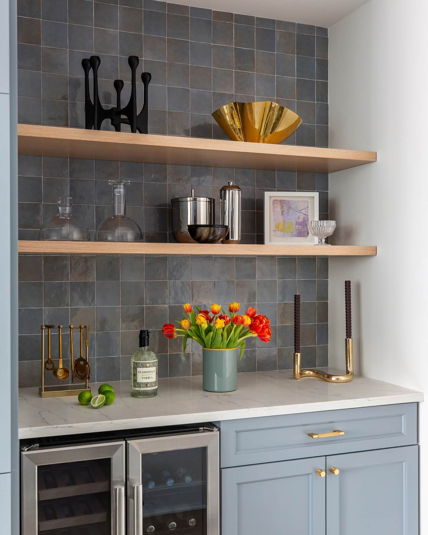 The artful placement of decor items on the shelves, such as vibrant flowers and vintage pieces, adds personality and flair to the area. This thoughtful synthesis of style and practicality transforms the space into an inviting hub for relaxation and socialization. The choice of textured tiles as a backdrop further elevates the overall look, providing a contemporary edge that complements the modern lines of the cabinetry.