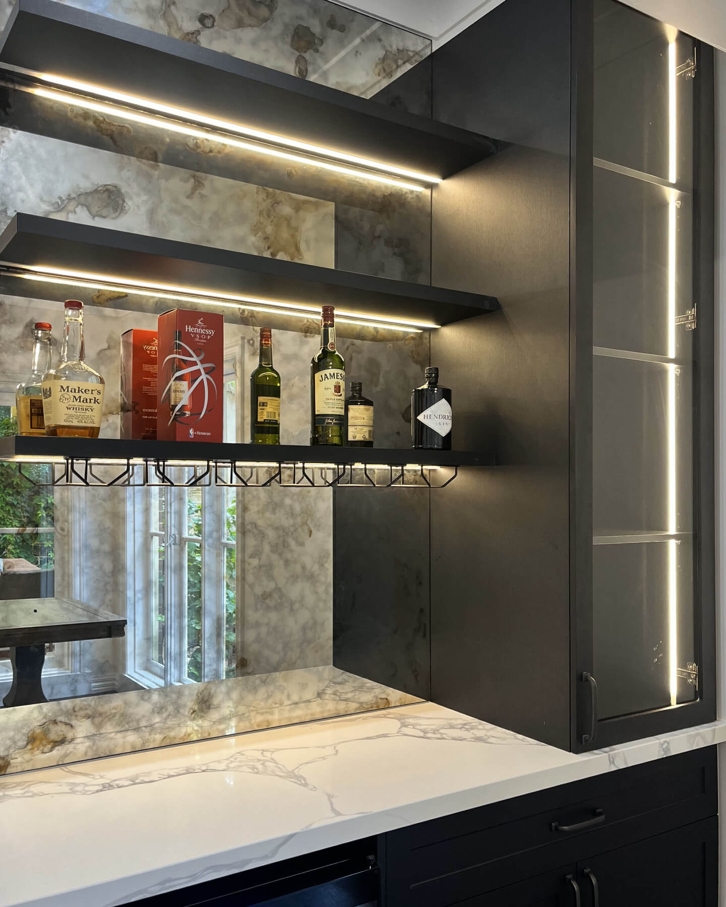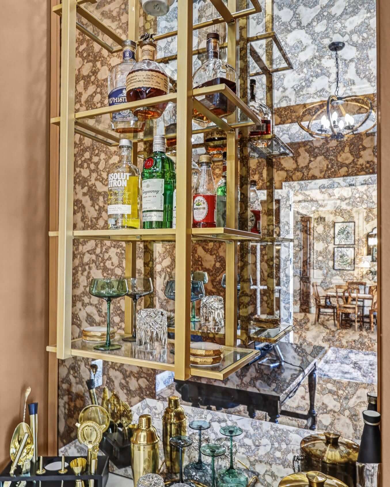 The use of gold-toned hardware elevates the luxurious feel, pairing beautifully with the rich, reflective surfaces. This effect is visually striking, enhancing the allure of the bottles and bar tools placed artfully on the shelves. The consistent use of metallic tones across elements ties the design together, making the nook a cohesive part of your home’s decor.