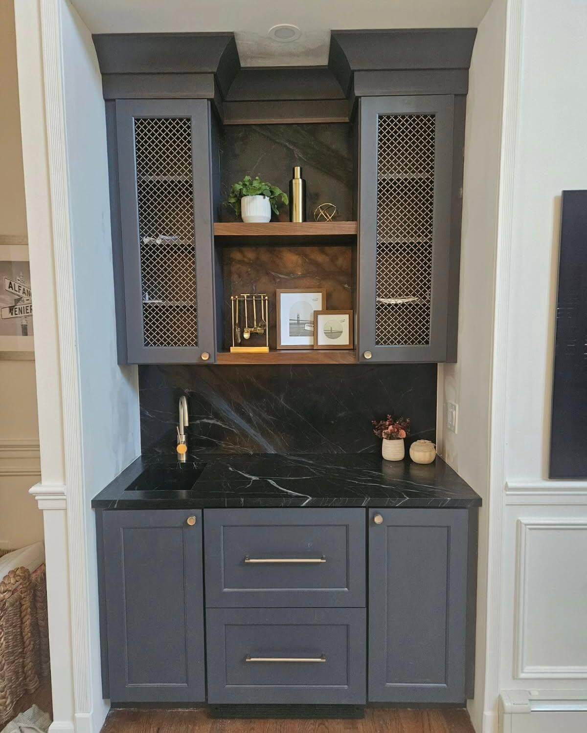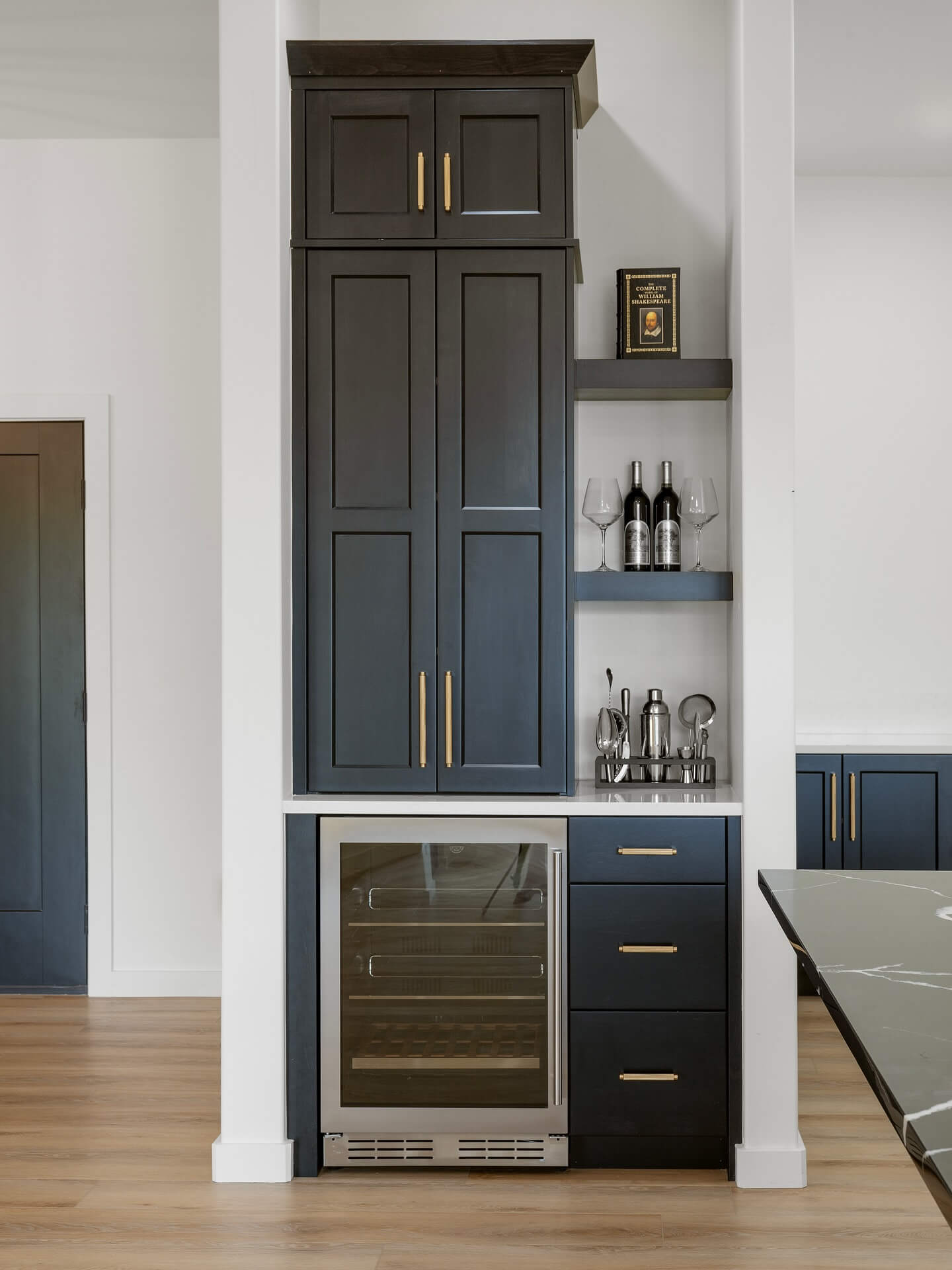 Dark cabinetry combined with gold accents brings a timeless sophistication to your bar nook. This design balances elegance with practical storage solutions, making it a standout feature in any home. The tall, sleek cabinets conceal ample storage, while the contrasting golden handles add a touch of glamour.