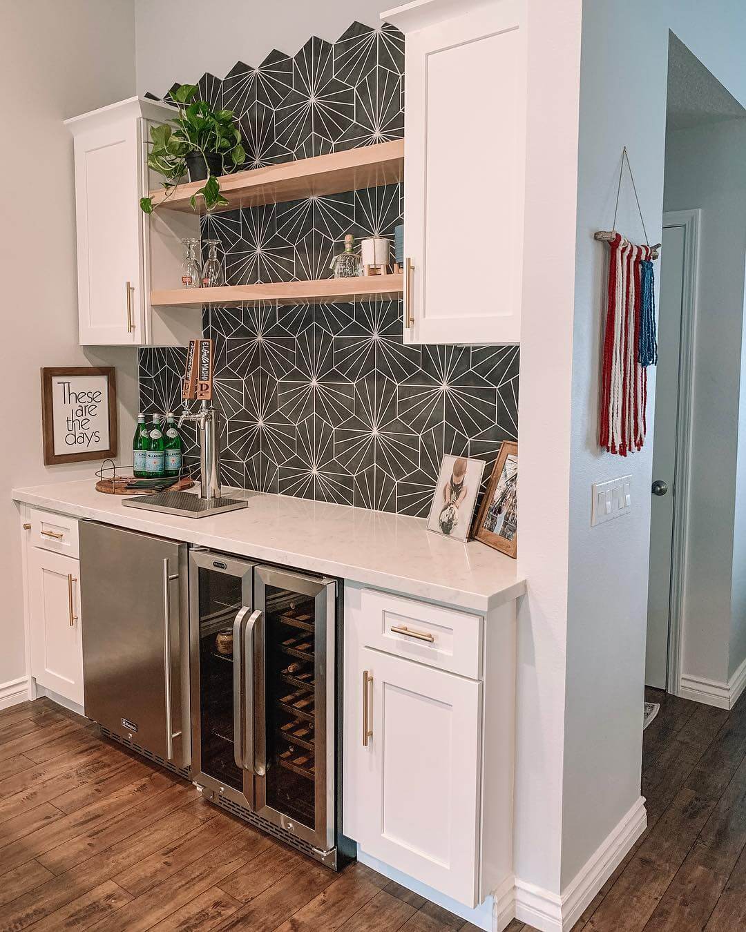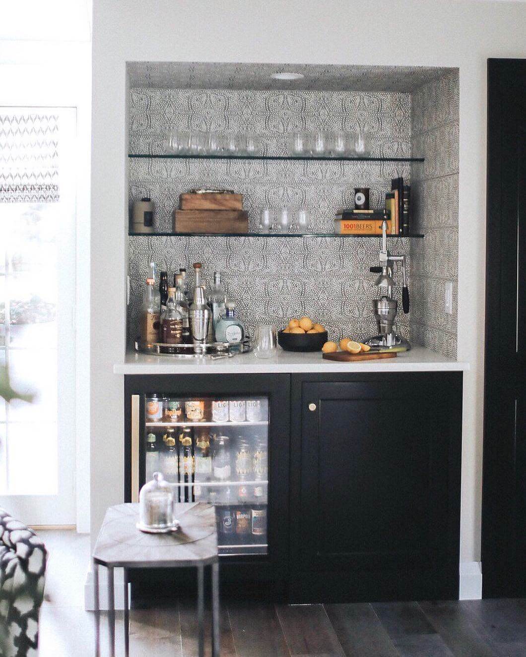 The combination of modern simplicity with striking patterns makes this bar nook a versatile addition, fitting seamlessly into both contemporary and eclectic home styles. It’s an inspiring choice for those looking to infuse their spaces with a touch of whimsy while maintaining functionality.