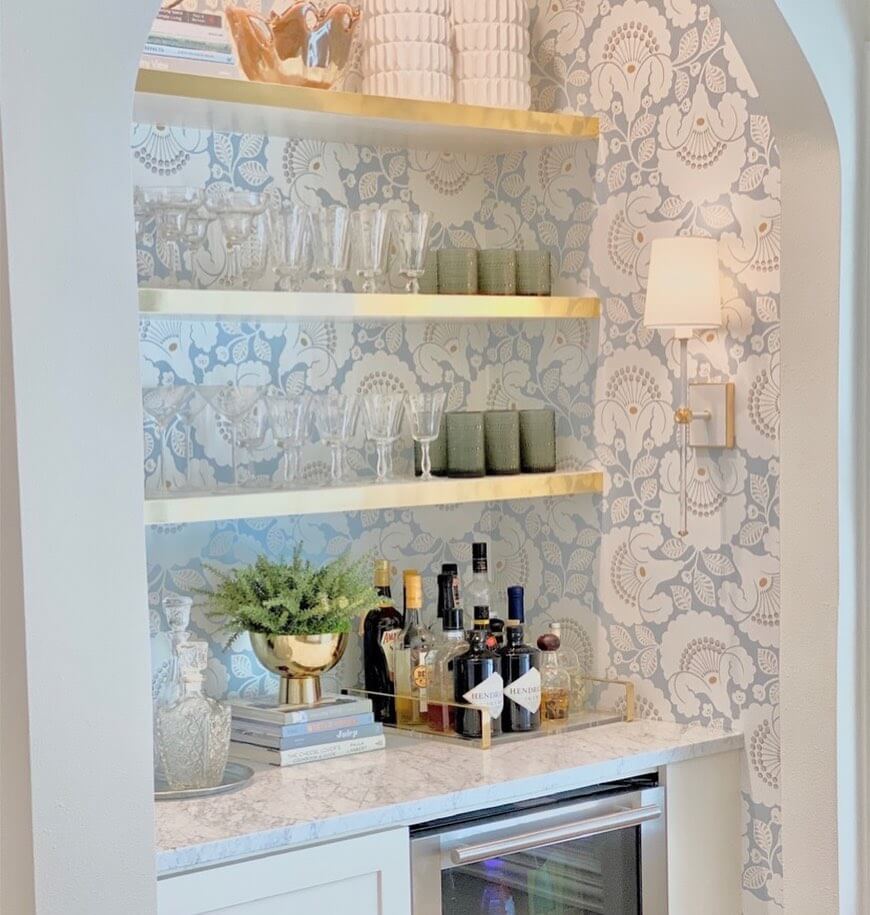 Integrate tranquility into your home with a bar nook that uses soft pastels and delicate patterns to create a calming retreat. The charming use of light blues and whites, complemented by ornate wallpaper, introduces a serene atmosphere that invites relaxation and leisure.