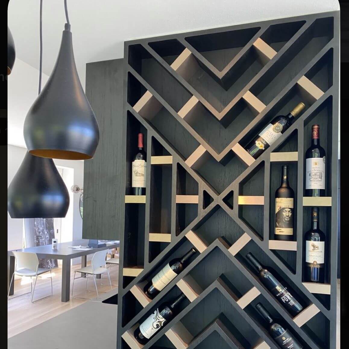 The use of bold, angular lines in a dark finish offers a striking contrast to the wine labels, turning your collection into a focal point. This modern, eye-catching setup seamlessly integrates with contemporary decor, providing not just utility but also a visual statement.