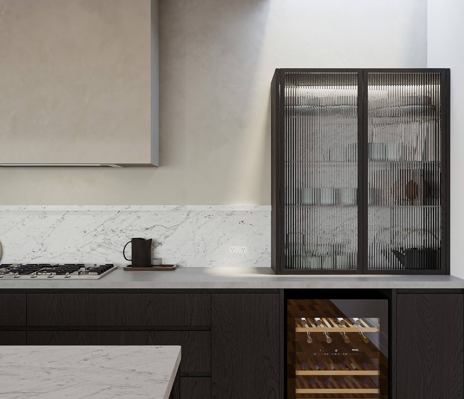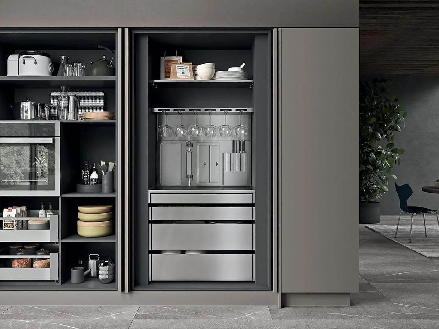 The cool gray tones and minimalist hardware are perfect for those who prefer a subdued, contemporary look. Inside, sophisticated storage solutions like slide-out shelves and wine glass hangers maximize space without compromising on accessibility or style. This setup is ideal for a kitchen or open-plan area where discretion and efficiency are key.