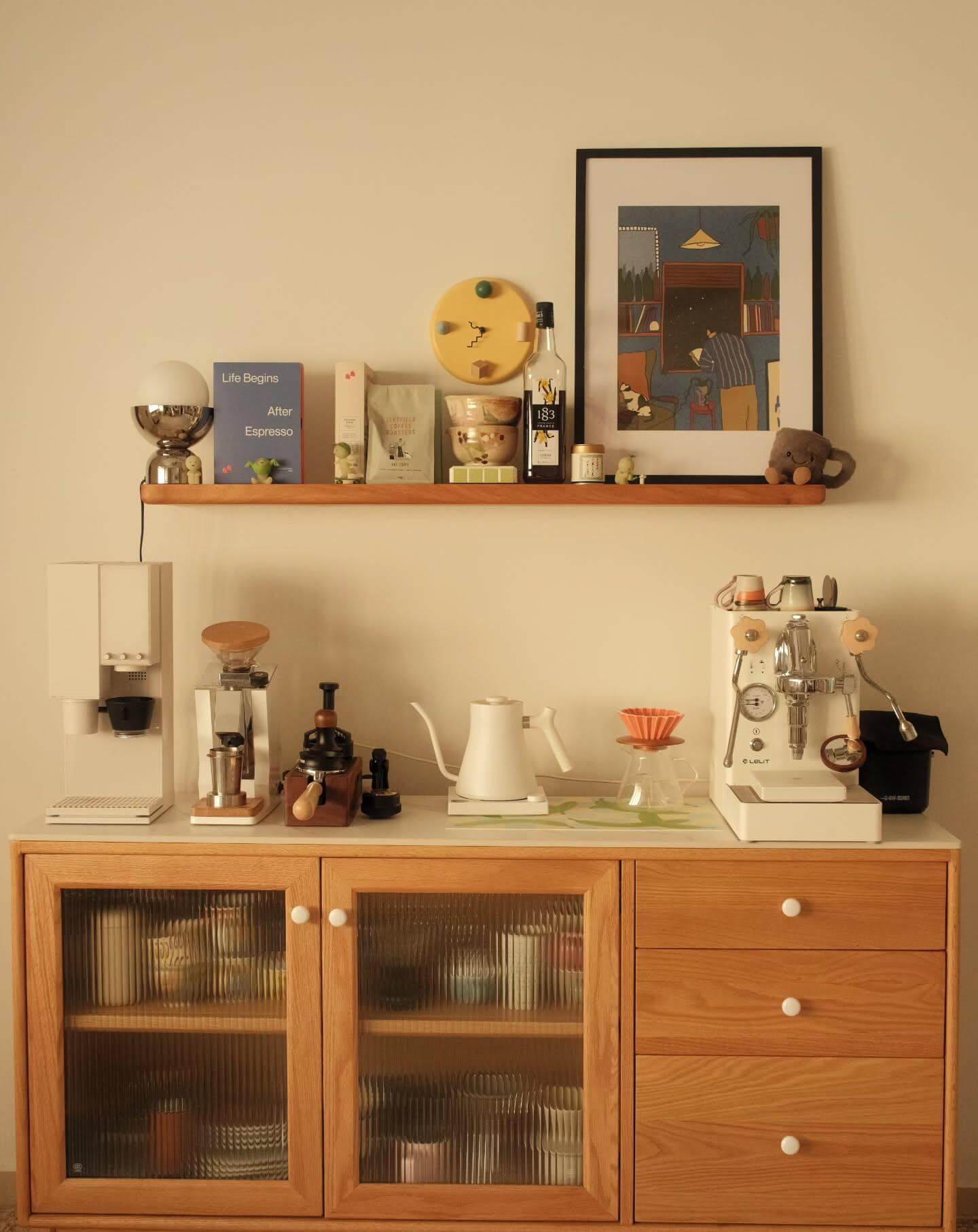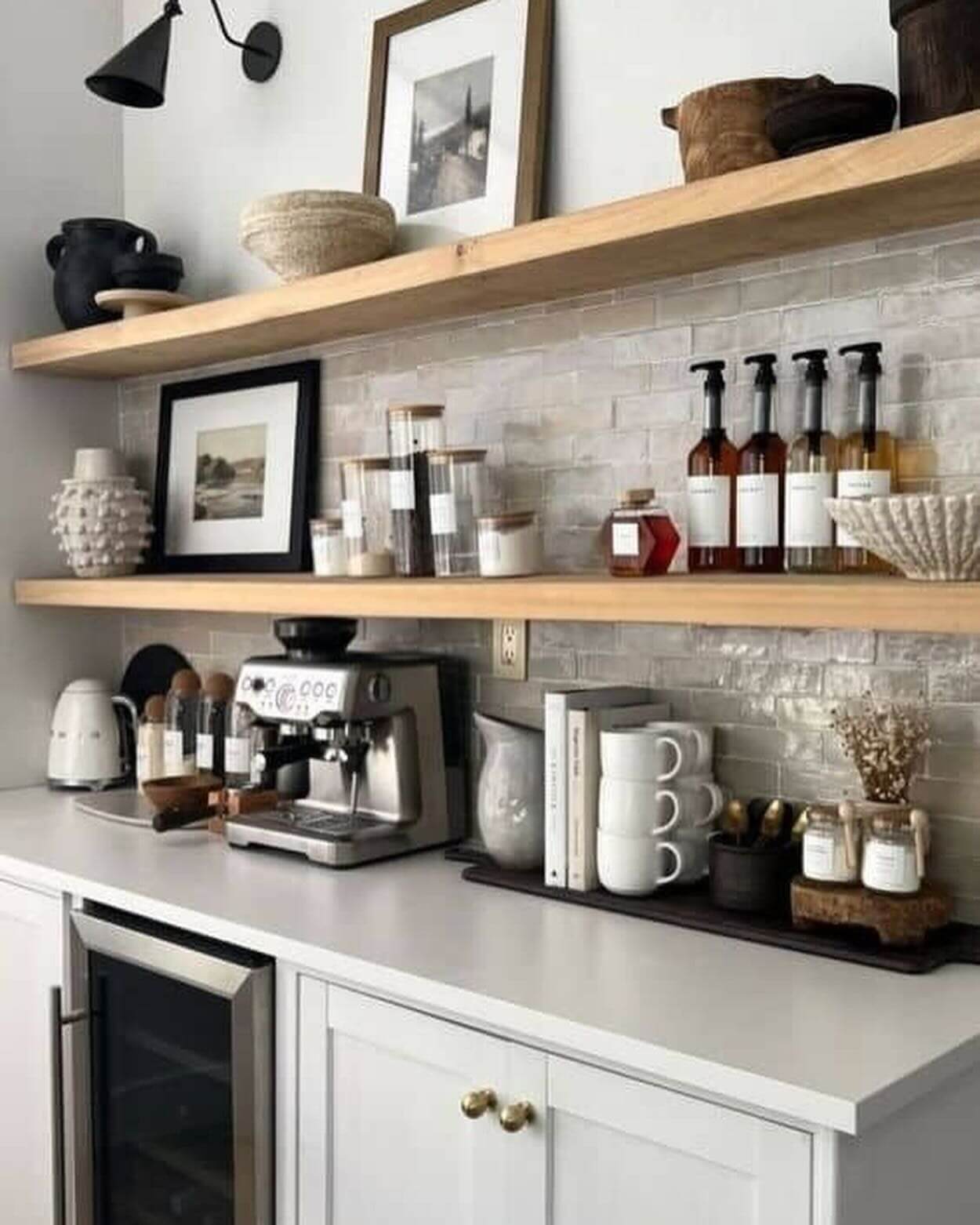 Perfect for kitchens or casual dining areas, this coffee bar setup encourages slow mornings and relaxing afternoons, making it a delightful and functional addition to any home.