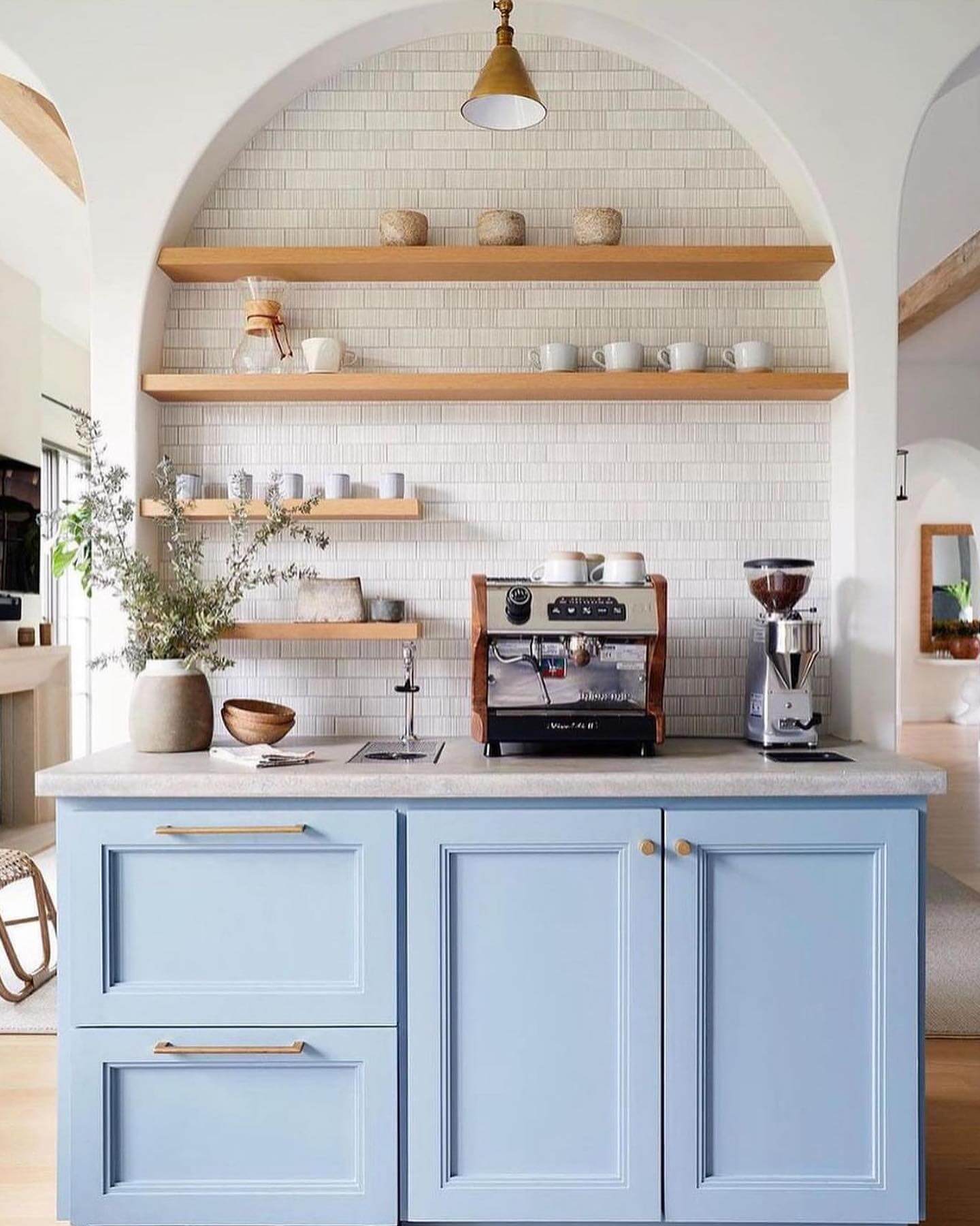 Transform a simple corner of your kitchen into a quaint espresso bar nook that exudes warmth and charm. The light blue cabinetry provides a refreshing contrast, creating a welcoming space that is both functional and aesthetically pleasing. Wooden open shelves offer ample storage, displaying an array of coffee essentials and charming decor pieces without overpowering the design. The touch of greenery adds a lively element, making your morning coffee routine feel like a serene retreat. This setup not only elevates your kitchen’s functionality but also enhances its style, perfect for coffee enthusiasts seeking a daily dose of tranquility.