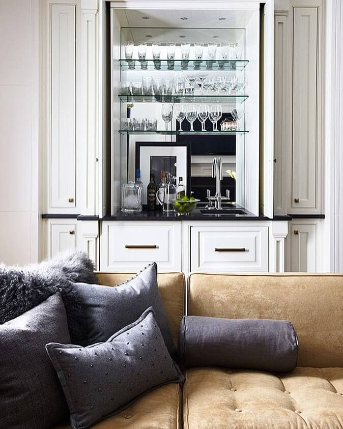 Incorporating mirrors into your bar nook not only enhances the sense of space but also adds a touch of opulence. This setup features a mirrored backdrop that reflects the shimmering bottles and crystal glassware, creating a light-filled, airy atmosphere. The vertical arrangement of the shelving allows for optimal display and easy access, emphasizing both form and function.