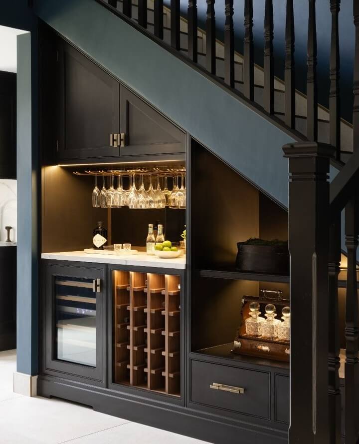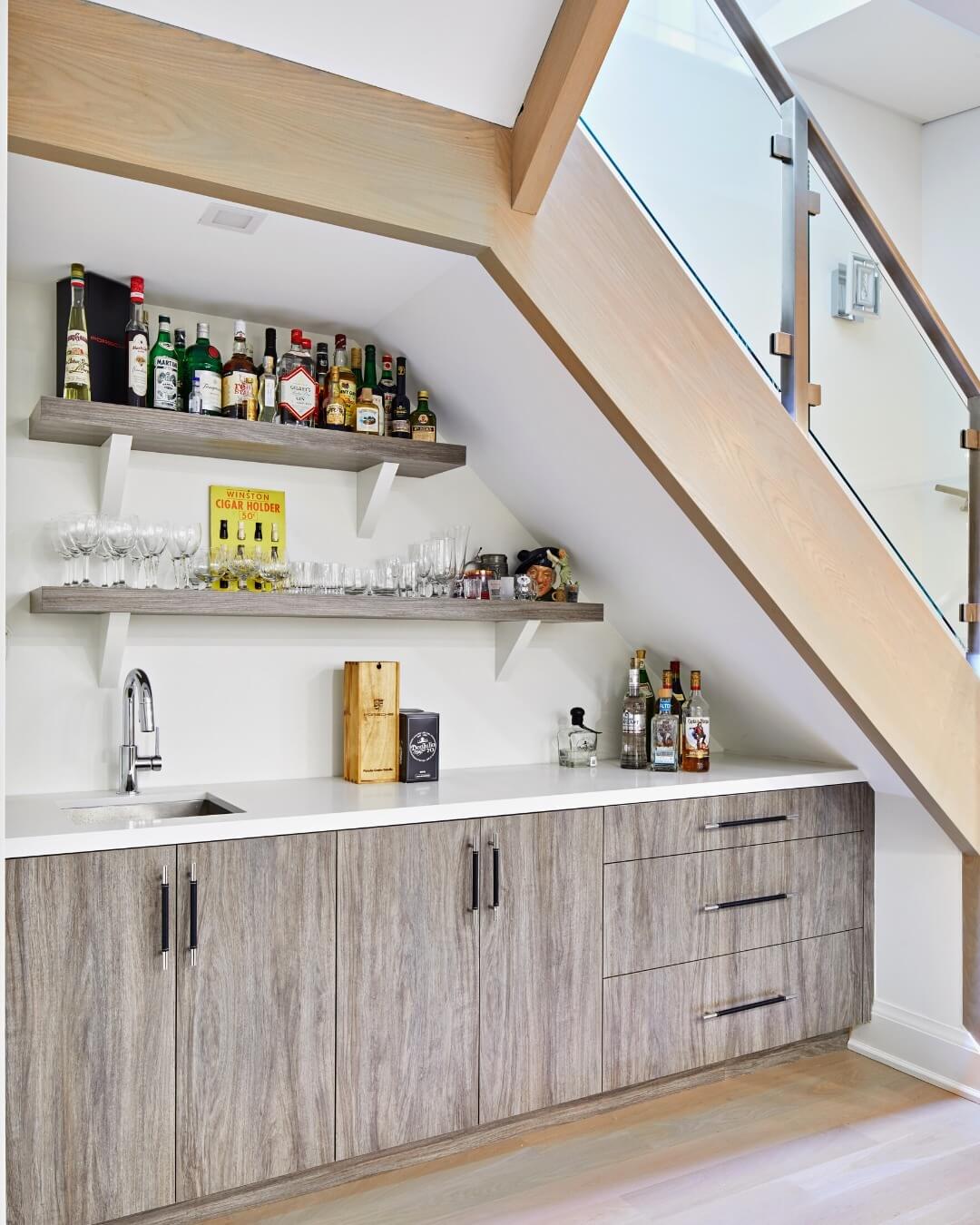 Utilize every inch of your home with an innovative under-stair bar nook that maximizes space without sacrificing style. The sleek cabinetry and open shelves are expertly fitted into the alcove, creating a stunning and practical storage solution. The combination of natural wood and contemporary materials adds warmth and sophistication to the space. Perfect for displaying an array of spirits and glassware, this clever configuration turns an underutilized area into a vibrant hub of activity, ideal for cocktails and casual gatherings. This concept exemplifies ingenious space utilization, inviting creativity and conviviality into your home.