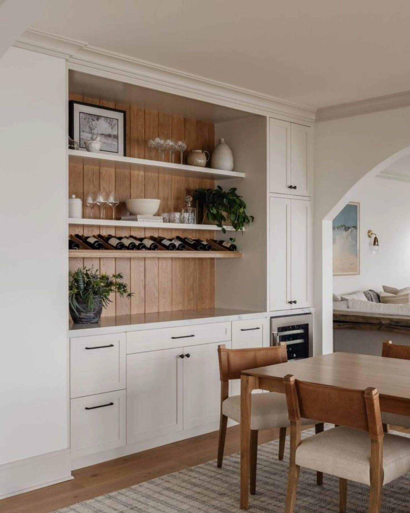 A seamlessly integrated bar nook within a dining area combines classic cabinetry with modern accents. The use of open wooden shelves against a warm background creates a cozy yet sophisticated atmosphere. Display both fine wines and charming decor to add personality and texture to your space. This arrangement balances functionality with aesthetics, offering a space fully equipped for casual or formal gatherings. It’s a delightful example of how contemporary and traditional elements can harmoniously coexist, offering a stylish solution that enhances your dining room’s overall appeal.