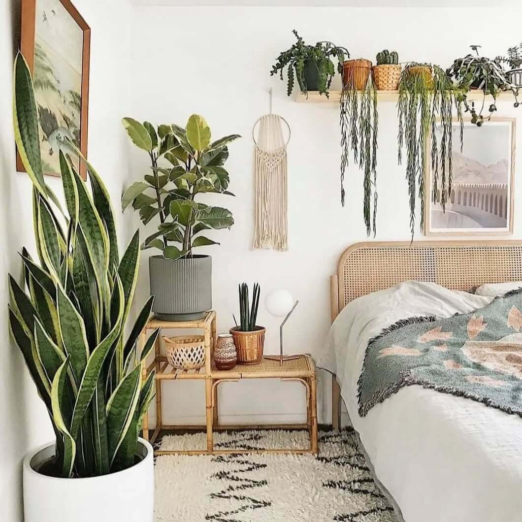 You can frame your bed in foliage without hanging anything directly above your head. Build an offset backdrop by flanking the headboard with two vertical moments: a tall floor plant on one side (parlor palm, rubber plant, or a slim snake plant) and a trailing plant trained along removable hooks or a side rail on the other (pothos, heartleaf philodendron, or satin scindapsus). This creates a gentle “living headboard” that reads cozy and intentional while respecting safety.