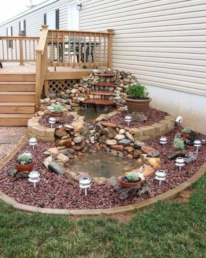 If digging is tricky (tree roots, clay, utilities) or you’re renting, build up instead of down. A no-dig, above-ground backyard pond uses a compacted gravel pad, stacked retaining wall blocks, and a single piece of EPDM liner to create instant water garden serenity. Dry-lay a level ring of blocks on tamped base rock, add foam underlayment, then drape the liner with generous slack. Cap with smooth coping stones that fold the liner safely out of UV and foot traffic. Inside, set DIY planting shelves with upside-down milk crates wrapped in geotextile for marginals; add a small pump protected in a crate prefilter and return water via a discreet side outlet or a mini spillway. The raised edge works as built‑in seating, keeps mulch out, and deters pets. Finish the look with vertical grasses, dwarf lilies, and a pea‑gravel beach on one side for wildlife access. This modular approach scales from whiskey‑barrel footprints to statement rectangles and pairs perfectly with a bog filter box for low‑maintenance clarity. It’s one of the most budget‑friendly DIY backyard pond ideas that still looks custom and lasts through freeze‑thaw cycles thanks to flexible liner and dry‑stacked stone.
