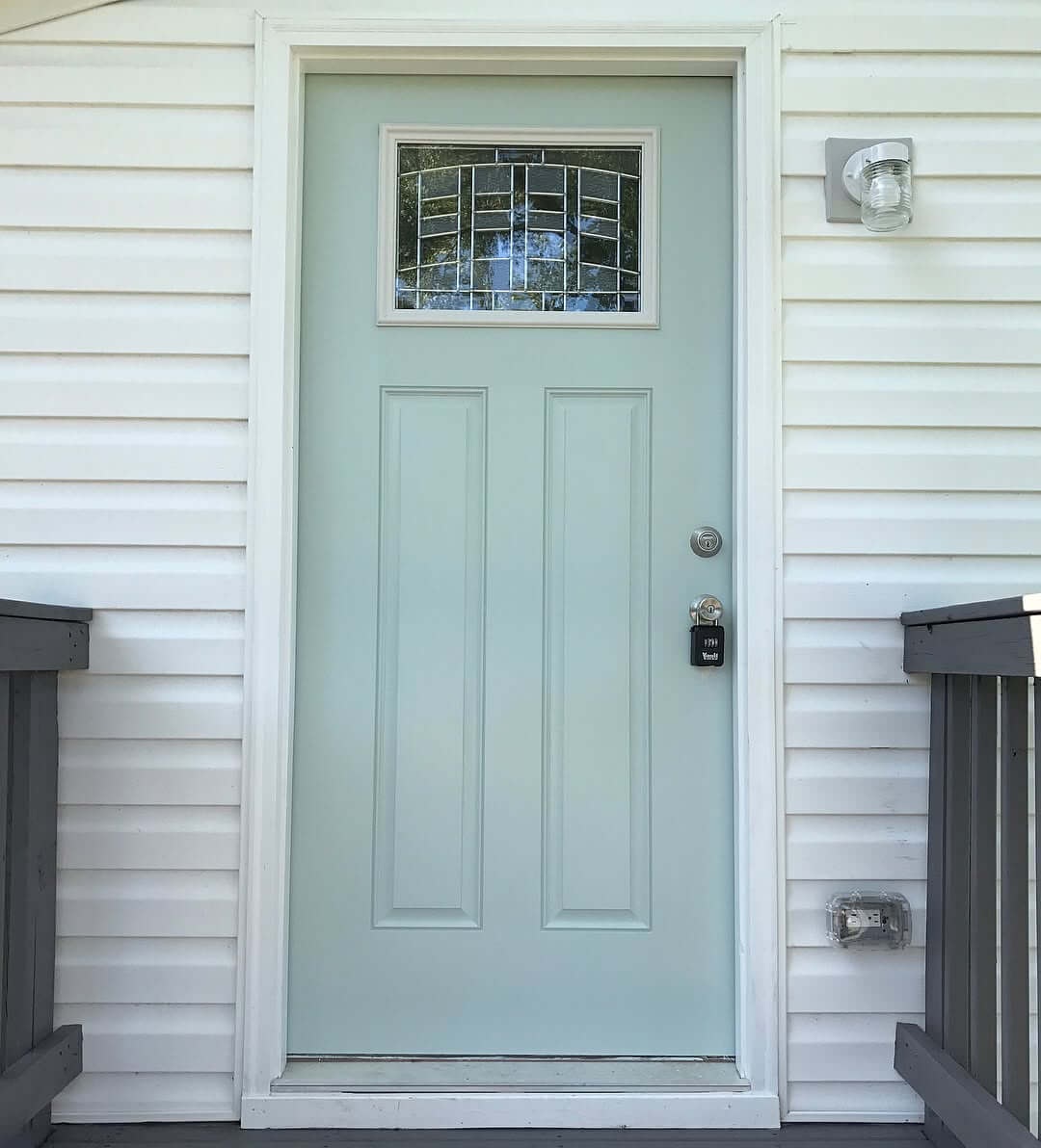 For a soft, welcoming entry with storybook charm, powder blue (or robin’s egg) is a delight. This pale, airy hue brings a calming note to white clapboard, light gray shingles, and even red brick when you choose a blue with a whisper of gray. It’s a favorite for cottage and coastal-inspired homes because it mirrors sky and sea, making porches feel breezier and brighter. Keep the palette simple—clean white or warm ivory trim, woven textures, and greenery—to let the color set the mood. Nickel or chrome hardware enhances the coastal vibe; antique brass adds warmth for traditional exteriors. Because lighter blues can shift with daylight, sample options in morning shade and afternoon sun; a touch of gray will keep the color from reading baby blue. A satin or semi-gloss finish maintains a fresh feel and makes cleaning easy. Accent with striped cushions, hydrangeas, or a classic black lantern to finish the relaxed, timeless look. It’s an instant mood-lifter that quietly boosts curb appeal.