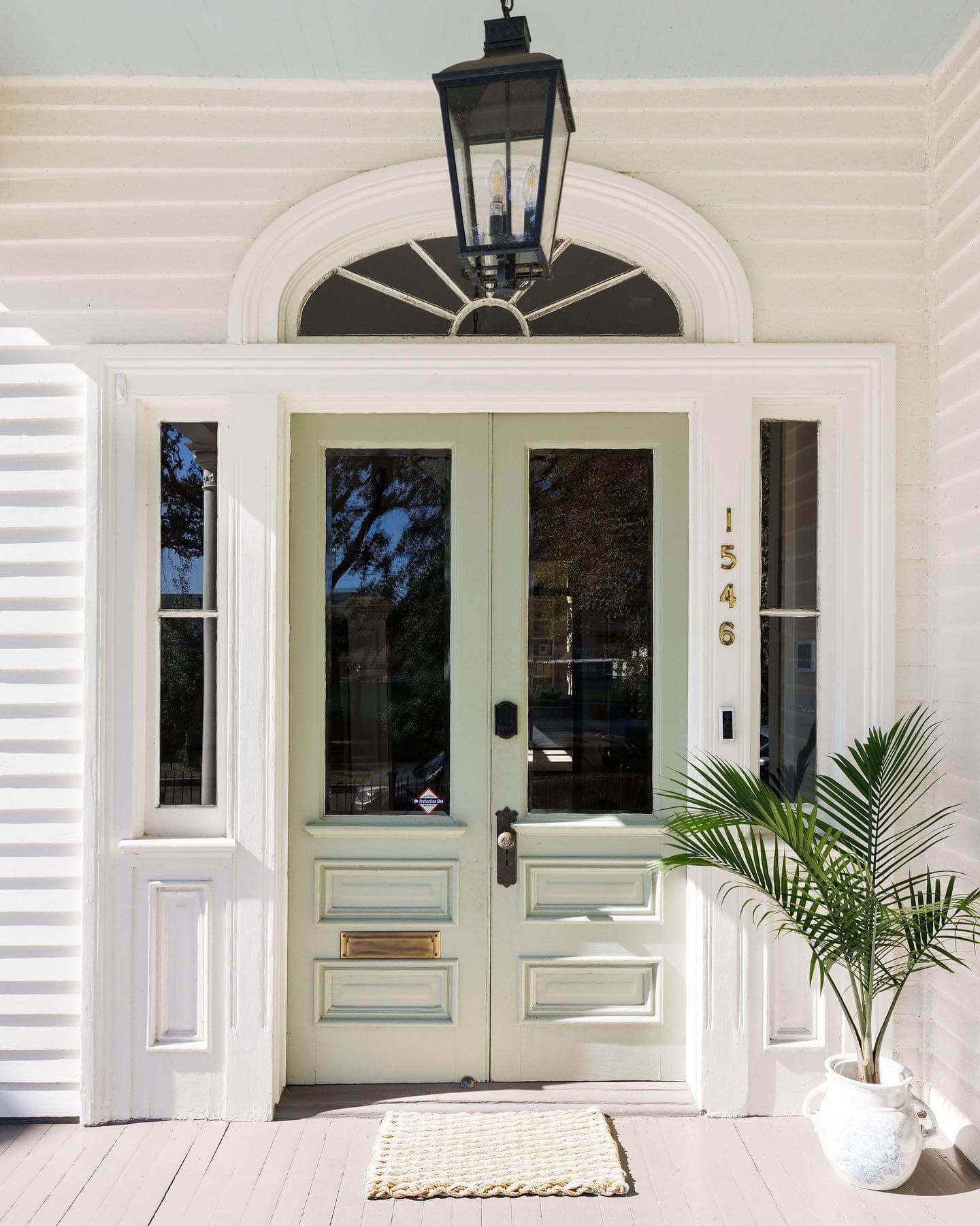 For an organic, calming entry, soft sage is a standout. This mid- to light-value green with gray undertones harmonizes with stone foundations, tan stucco, weathered shingles, and creamy trim. It’s an especially good fit for craftsman and cottage architecture where you want the landscape and architecture to feel connected. Because greens swing wildly in sunlight, test sages with different undertones: a silvery sage reads airy on north-facing porches, while a slightly olive-leaning sage adds warmth against red or brown brick. Black hardware brings sharp definition; aged bronze or antique brass complements the earthy vibe. Keep supporting colors natural—putty, bone, or warm white trim; terra-cotta planters; woven door mats—so the entry feels collected rather than busy. For durability, use an exterior enamel with UV protection; green pigments can fade in intense sun. If your landscaping includes boxwood or evergreen topiaries, sage echoes the foliage without competing. The result is a serene welcome that feels timeless across seasons, equally at home with pumpkins in fall or fresh florals in spring.