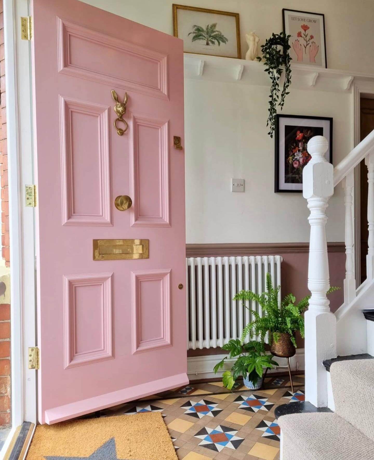 Dusty blush—think desaturated rose with a hint of taupe—turns a front door into a subtle statement. It’s warmer than gray yet calmer than pink, which makes it a chic choice for white brick, greige siding, and black or bronze hardware. The magic is in the undertone: choose a blush with a touch of brown or mauve so it reads modern and architectural rather than sweet. In bright sun, the color feels welcoming and luminous; in shade, it deepens to a refined neutral with just a suggestion of color. Aim for an LRV around 45–60 to keep it balanced across lighting conditions, and use a satin or semi-gloss enamel for durability. Dusty blush is particularly beautiful with copper or aged brass lighting, slate or checkerboard porch tile, and soft green plantings like eucalyptus or rosemary. If you’re coordinating shutters, consider a deep charcoal or olive to ground the palette. As a front door color idea, dusty blush offers the contemporary warmth designers love—quietly on-trend, surprisingly versatile, and instantly elevating to curb appeal.