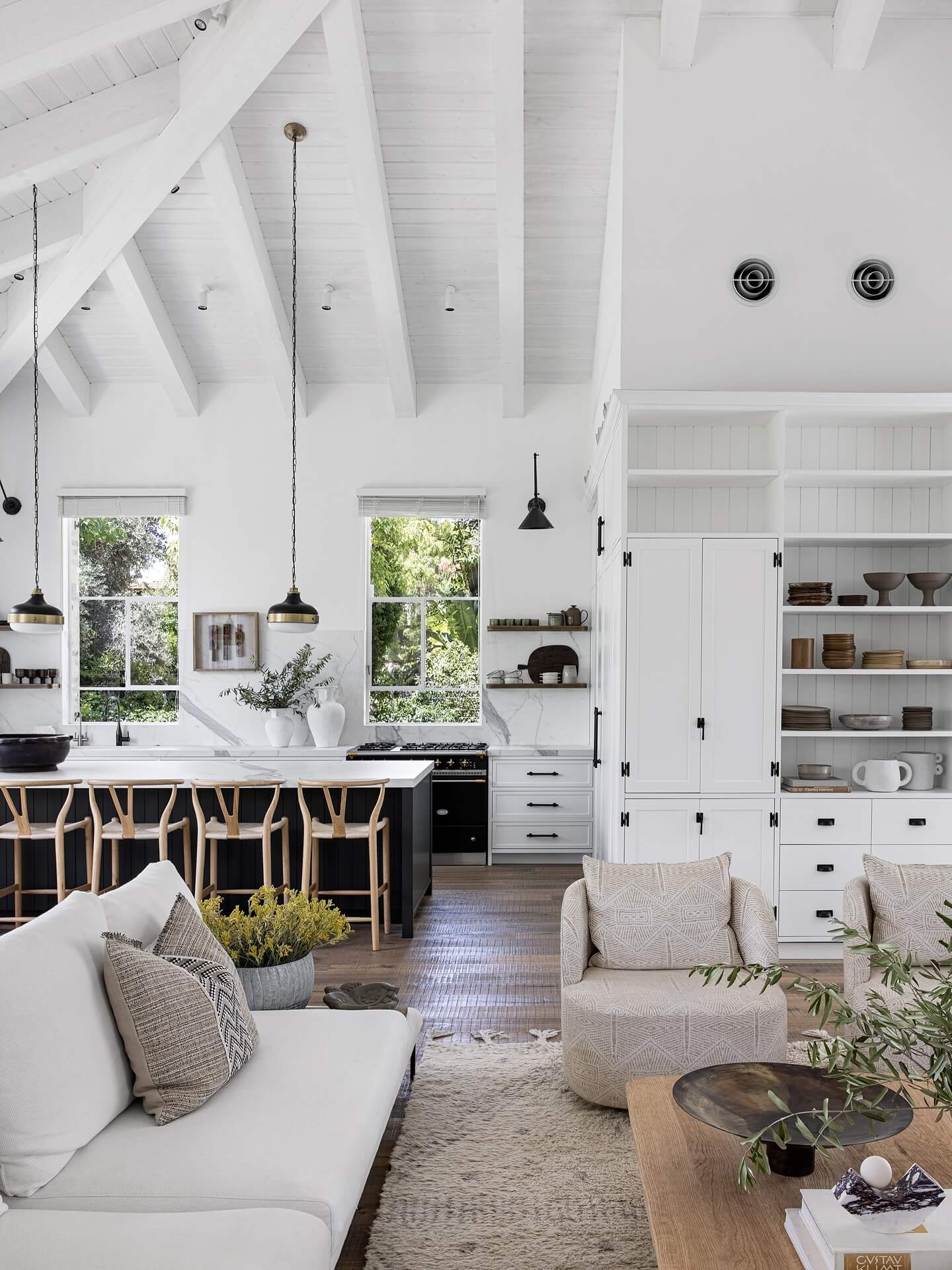 In open layouts, farmhouse style thrives when zones feel intentional yet relaxed. Start by anchoring the seating area with a generous jute rug layered under a vintage accent rug to set the living “island.” Float the slipcovered sofa perpendicular to the kitchen and back it with a rustic console (hello, lamps and baskets) to imply a gentle boundary. Use twin chairs to complete a conversation square, and align the coffee table with the room’s strongest axis—fireplace, window wall, or built-ins—to clarify flow. Repeat finishes across zones: iron pendants over the island, iron floor lamp in the living; oak stools, oak frame on a mirror. Keep pathways 36 inches clear, and let greenery or a tall cabinet act as soft screens without blocking light. The result is a cohesive, cozy modern farmhouse living room that breathes, functions, and welcomes a crowd.