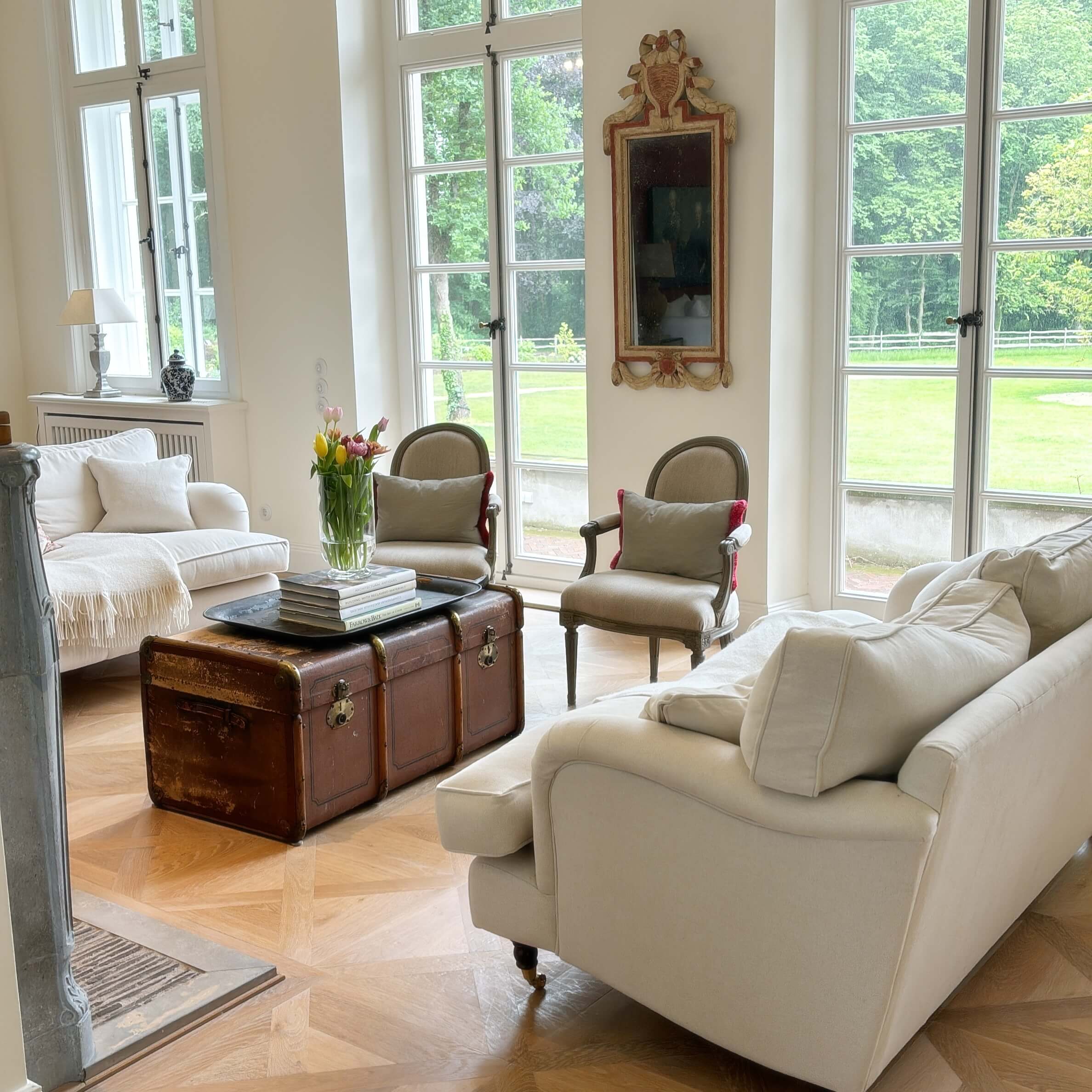 Mix Linen Slipcovers with Aged Leather for Lived-In Balance