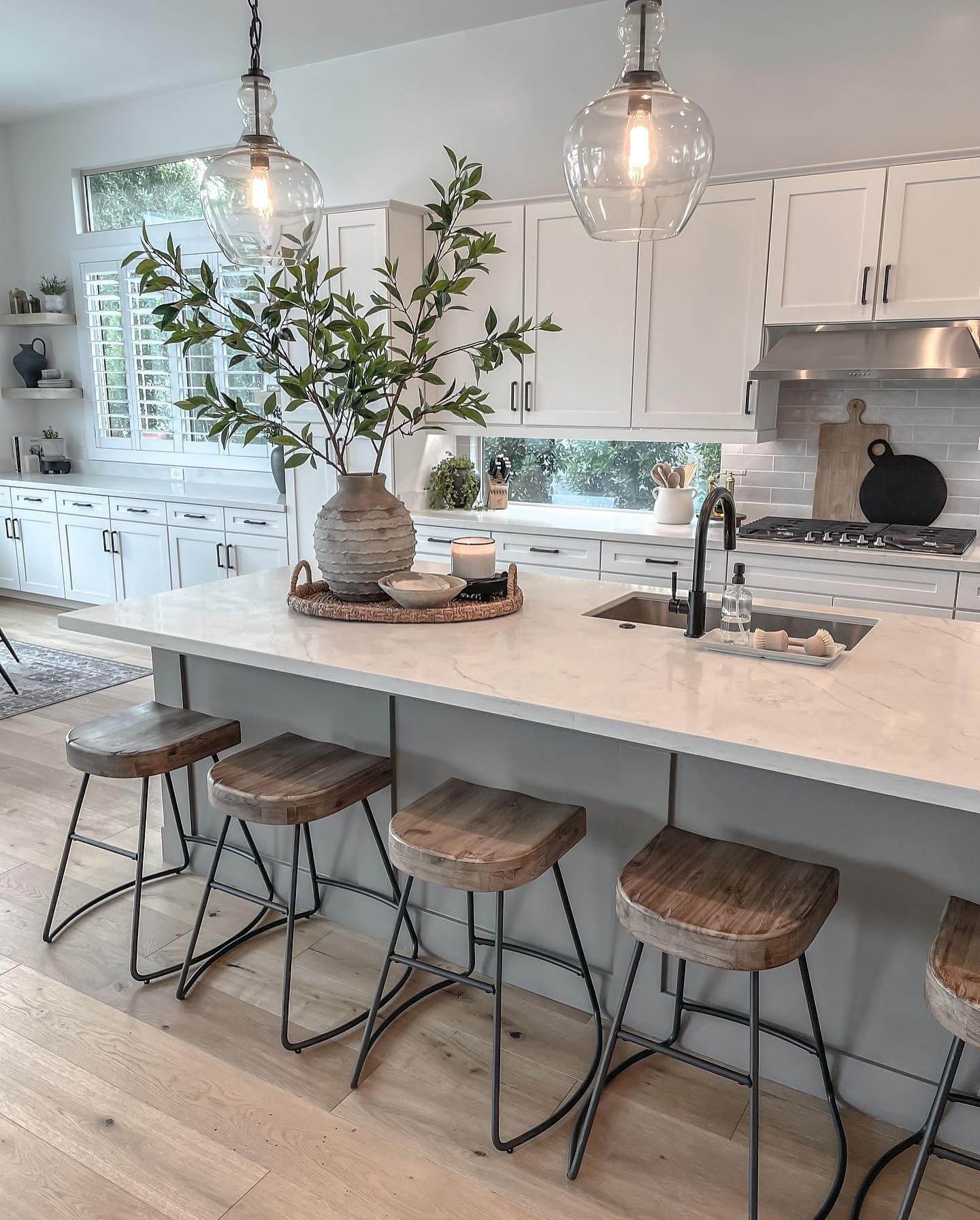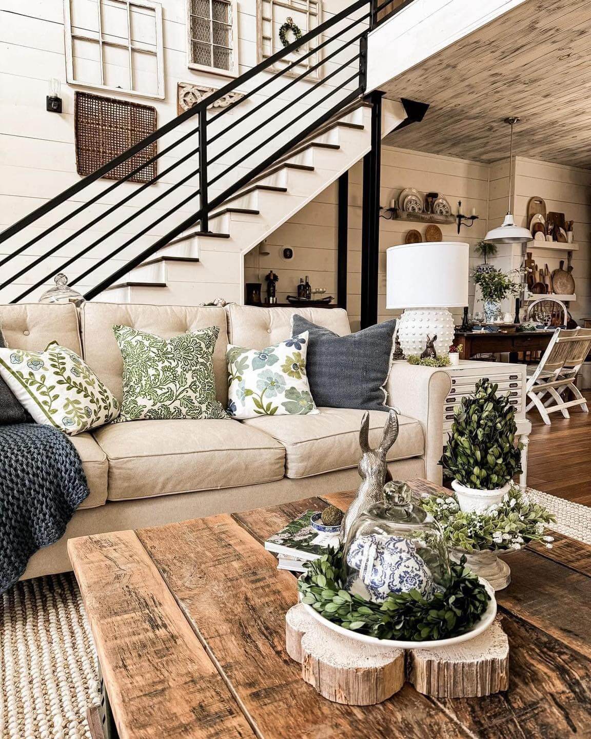 Nothing breathes life into a farmhouse living room faster than statement greenery. Go big with foraged branches—olive, quince, maple, or magnolia—in a weathered crock, tall demijohn, or handled earthenware jug. The generous scale adds sculptural height, softens hard lines, and instantly warms a neutral palette. Place a single, dramatic arrangement on a console, coffee table, or hearth to create an effortless focal point that feels collected, not contrived. Aim for airy silhouettes and uneven stems; farmhouse style thrives on natural imperfection. Repeat the green story with a smaller pot on a side table and a trailing plant on open shelves to create visual rhythm. If real clippings aren’t practical, choose high‑quality faux stems in muted, believable tones. For balance, layer nearby textures—linen, jute, aged leather—so the branches become part of a larger composition rather than a lone accent. Seasonal swaps keep the room feeling fresh: feathery spring blossoms, leafy summer stems, golden autumn branches, and wintry evergreens. This one styling move adds movement, texture, and authenticity—core to farmhouse living room decor—without overwhelming your space or your budget.