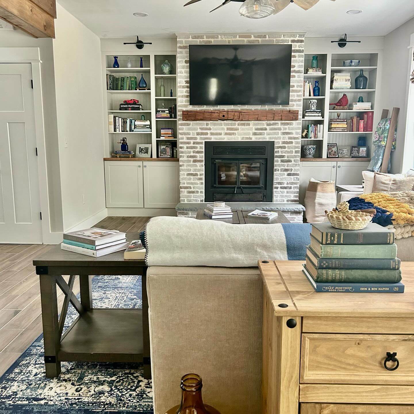 If you’re lucky enough to have a fireplace, let it define your farmhouse living room decor. Start by embracing honest materials—limewashed brick, stacked stone, or a plaster surround—then top it with a hefty reclaimed beam or chunkier painted mantel. Keep the palette soft (warm white, putty, or greige) so texture leads over color. Style is layered but restrained: lean a vintage landscape or charcoal sketch against the wall, flank with wood candlesticks or antique brass sconces, and tuck in a crock of olive branches or eucalyptus for organic height. Beneath, a woven basket of throws and a handled log carrier add utility and rustic charm. Consider a low hearth bench with linen cushions to turn the area into extra seating during gatherings. If your firebox is purely decorative, fill it with pillar candles, birch logs, or a stack of vintage books for a cozy, cottage look. Dimmers on nearby lamps and a mirror across the room will amplify the glow. This one move anchors the room, sets a timeless tone, and gives you a spot to refresh seasonally without redoing the whole space.