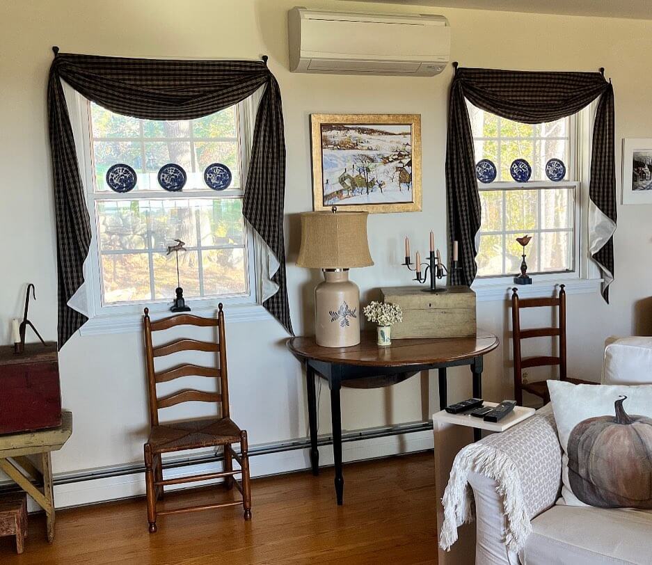 Window treatments make or break a cozy farmhouse living room. Opt for unlined or lightly lined linen panels in soft oat, ivory, or greige to keep the palette calm and the texture tactile. Hang them high and wide—rod 6–10 inches above the trim and extending past the frame—to elongate the room and maximize light. For privacy and layered depth, pair the drapery with natural woven shades in jute or bamboo; the duo feels custom and adds organic warmth that complements jute rugs and reclaimed wood. Use black or iron rods with ring clips for a subtle hit of contrast that echoes your lighting. Keep patterns gentle: ticking stripes or micro checks on a single roman shade can be all you need. The goal is soft movement, filtered light, and a tailored-but-easy finish that calms visual noise and lets your furniture, art, and greenery shine.