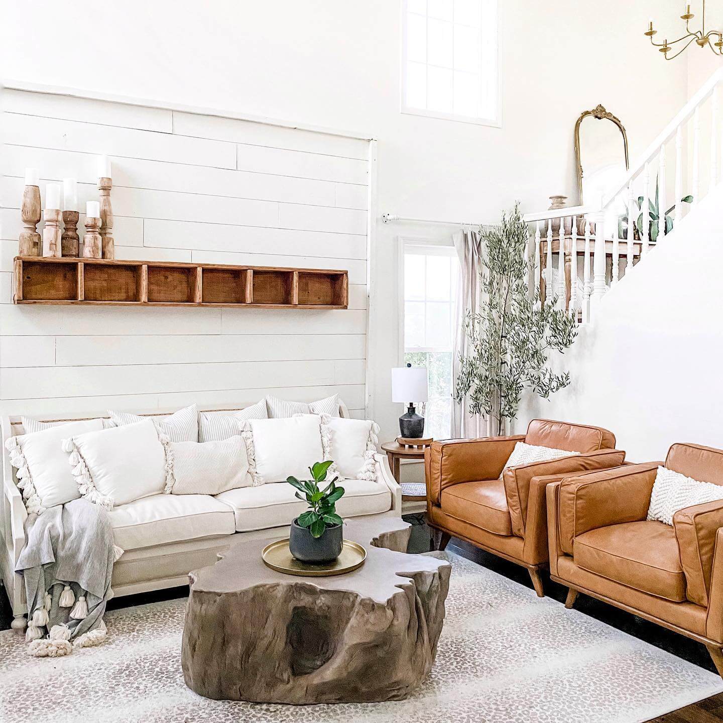 The most inviting modern farmhouse living rooms balance crisp with broken-in. Pair a slipcovered linen sofa—easy to wash, breezy, and textural—with an aged leather chair or two. The contrast does the heavy lifting: linen’s relaxed drape keeps the room light, while leather’s patina adds warmth and heritage. Stick to a grounded neutral palette (stone, oatmeal, camel, and saddle brown) so every piece layers effortlessly with your rugs and wood tones. Add a nubby throw, striped ticking pillows, and a lumbar in subtle plaid to echo classic farmhouse patterns without visual clutter. If you’re working with a smaller room, choose slimmer arms and elevated legs to keep the footprint airy; larger spaces can handle a deeper bench cushion and a beefier leather club chair. Performance fabrics extend longevity, and a beeswax conditioner keeps leather supple. Finish with a weathered-wood side table, a pottery lamp, and a jute rug underfoot to tie the mix together. This combination reads cozy yet elevated, photogenic yet family-friendly—exactly the lived-in balance that makes farmhouse decor feel both stylish and genuinely comfortable.