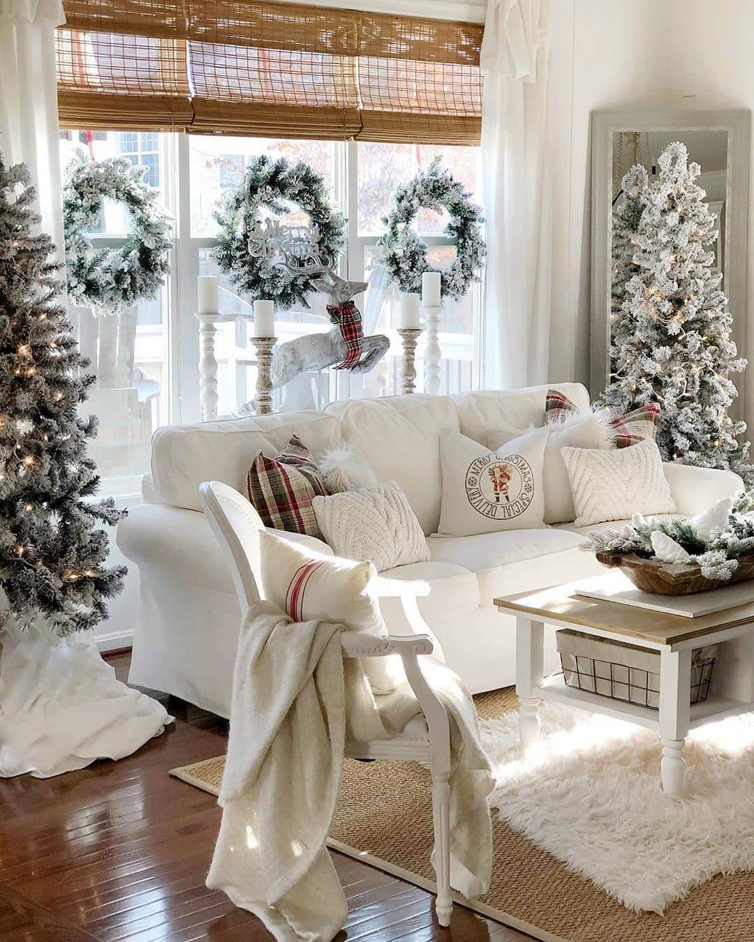 Winter seating invites a tactile mix that feels like your favorite sweater. Build a neutral base—ivory, oatmeal, and warm gray pillows in linen or cotton—then add depth with chunky knits, boucle, and a subtle plaid. Anchor each sofa or chair with three pillows in varied sizes (24, 20, lumbar) to create a pleasing slope; introduce one accent in charcoal, deep evergreen, or muted ochre to ground the palette. Drape a wool throw across the arm and a lighter linen at the foot for easy reach. If your room skews rustic, balance with refined details: a leather pillow, delicate fringe, or a stitched edge. For a cottage-leaning farmhouse, add petite florals and windowpane checks. Echo materials around the room—a jute rug, wood coffee table, iron lamp—to knit the space together. In the evening, skip overheads and rely on lamps, candles, and the glow of the fire for flattering, layered light. Everything looks cohesive because textures do the talking—and that’s the heart of cozy farmhouse winter decor ideas.