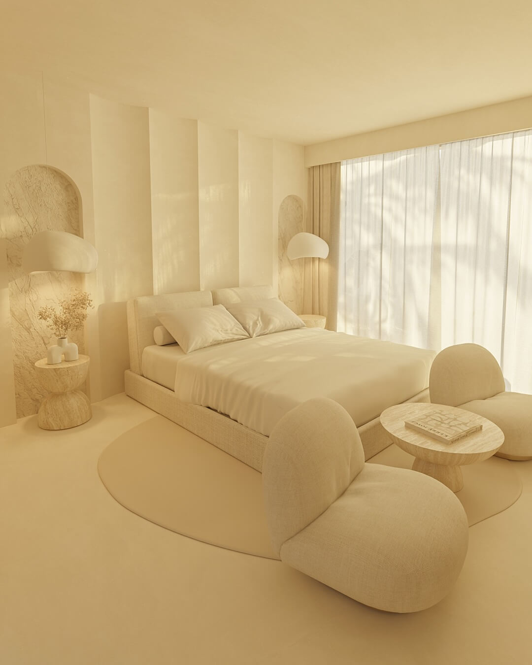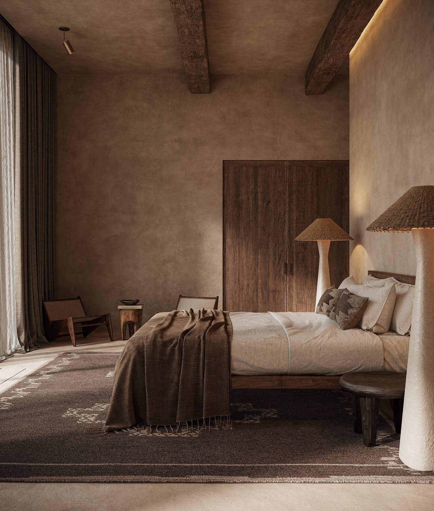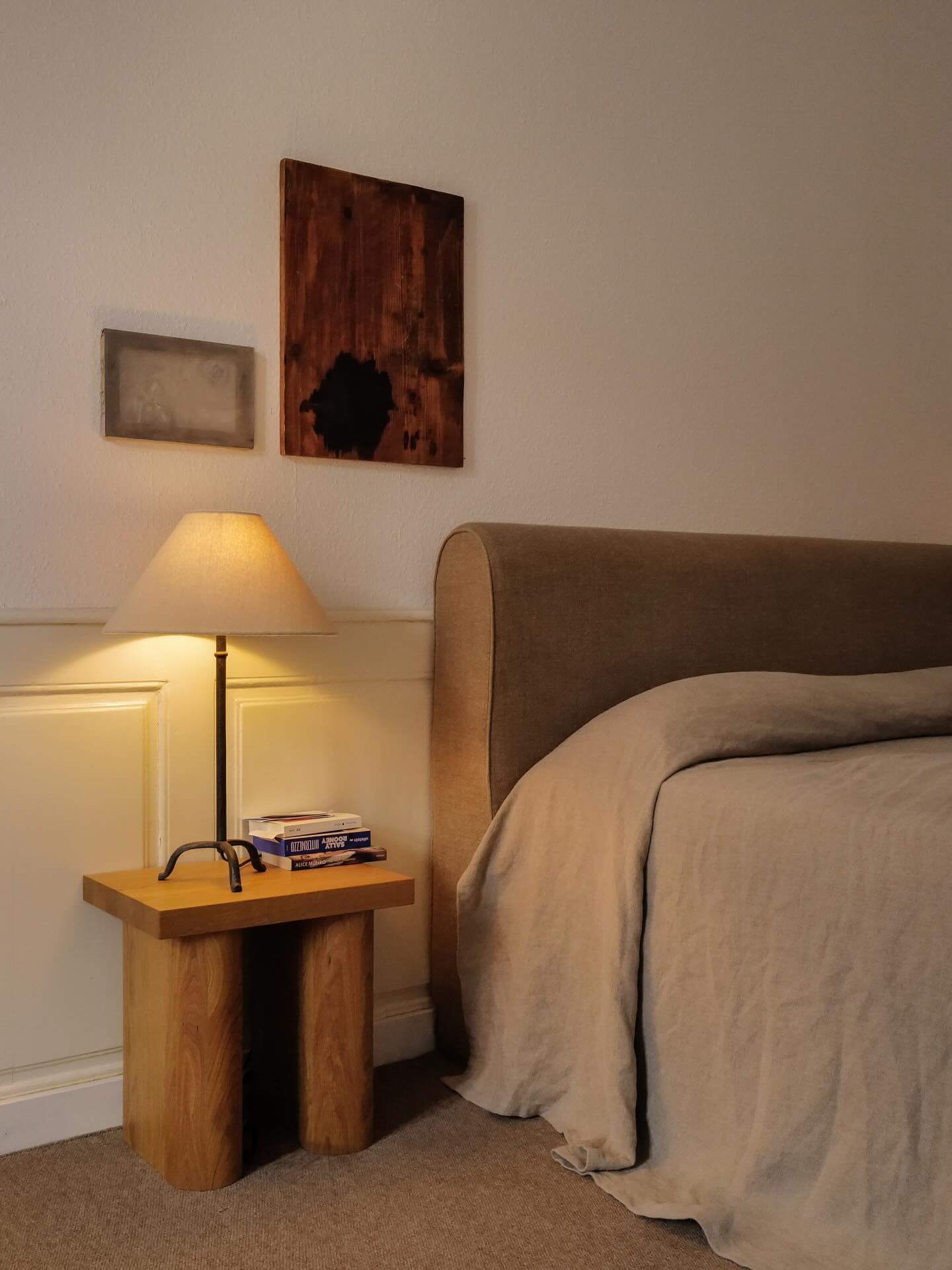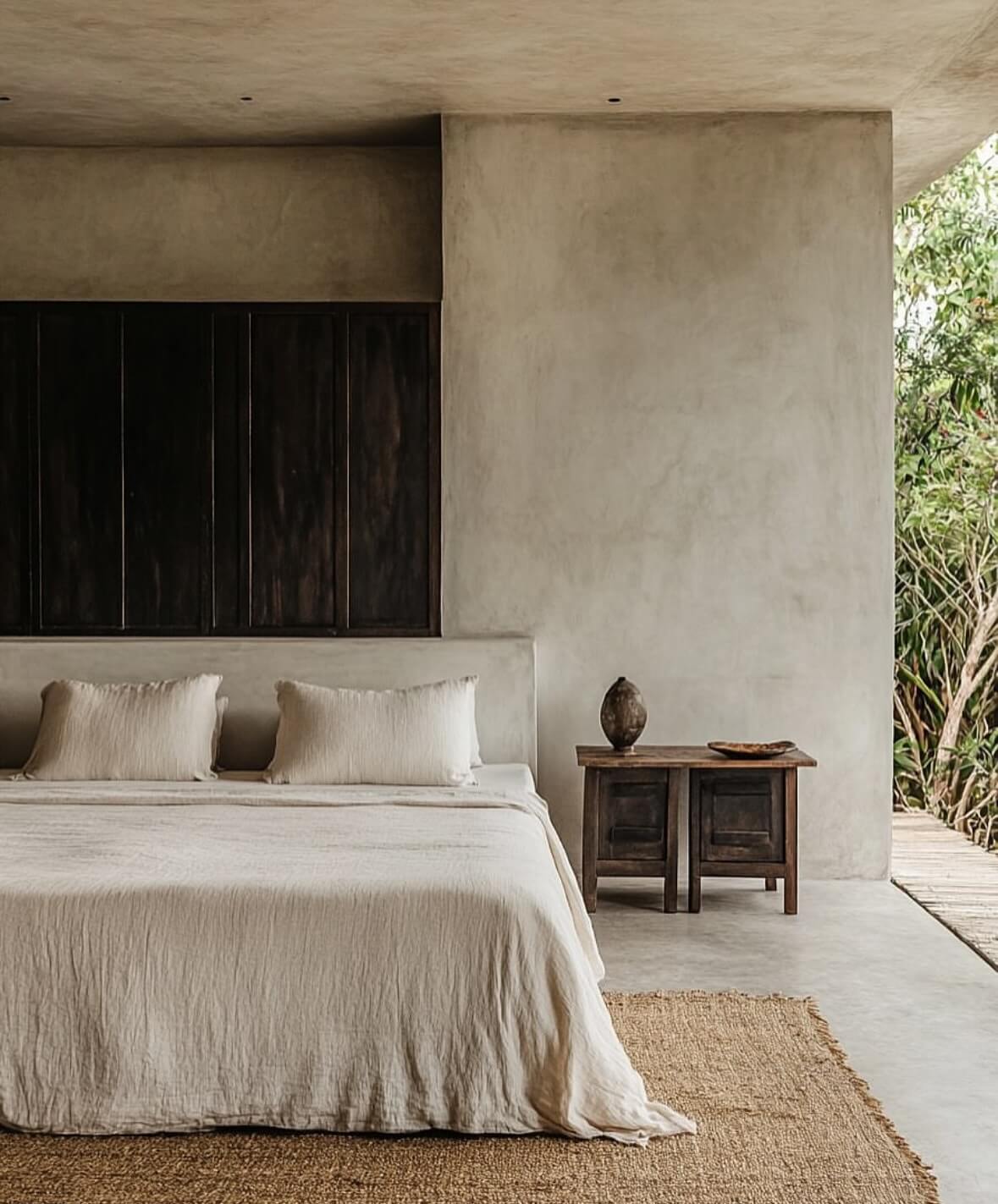 - A stone or plaster stool doubles as a bedside table, its irregular surface adding tactility while keeping forms simple, grounded, and visually quiet.