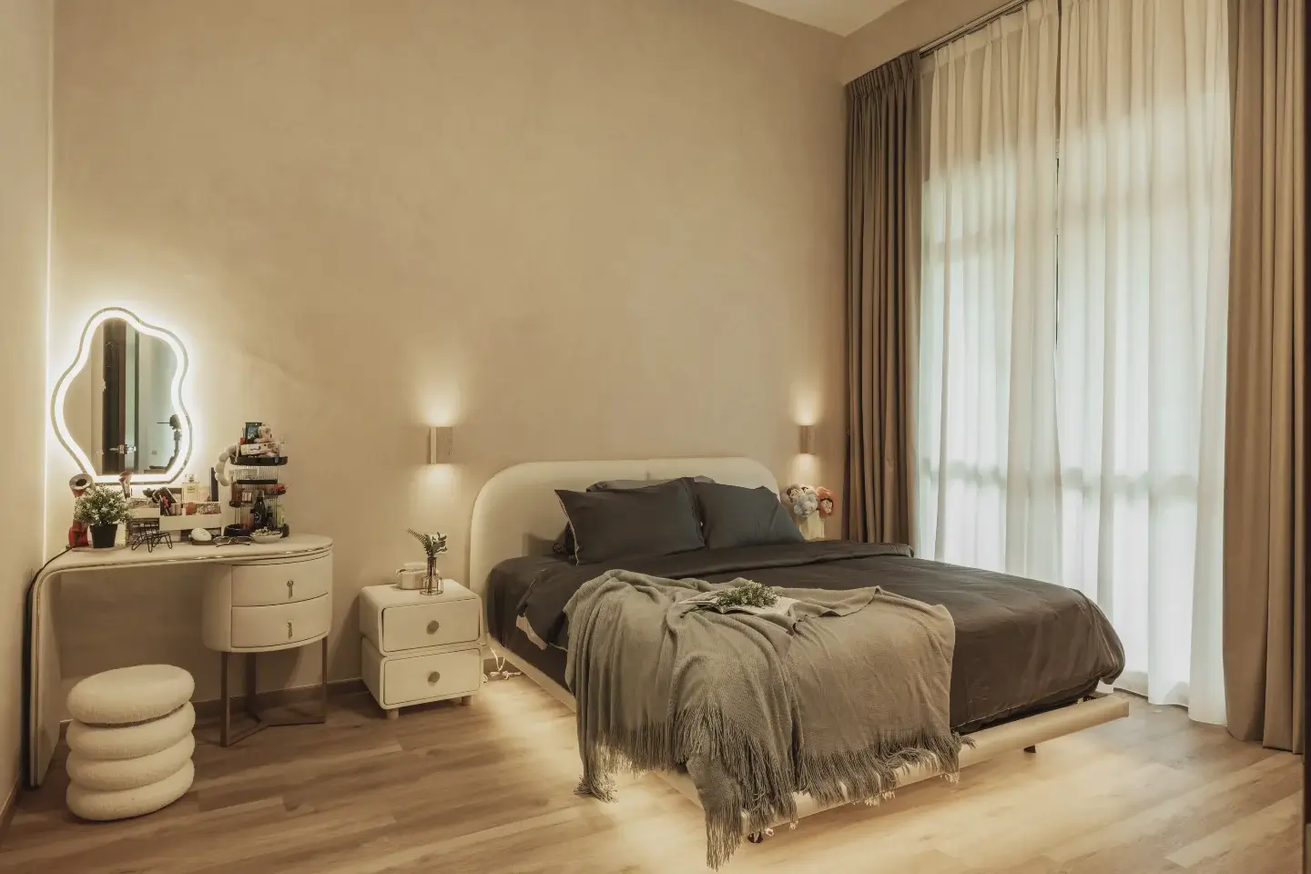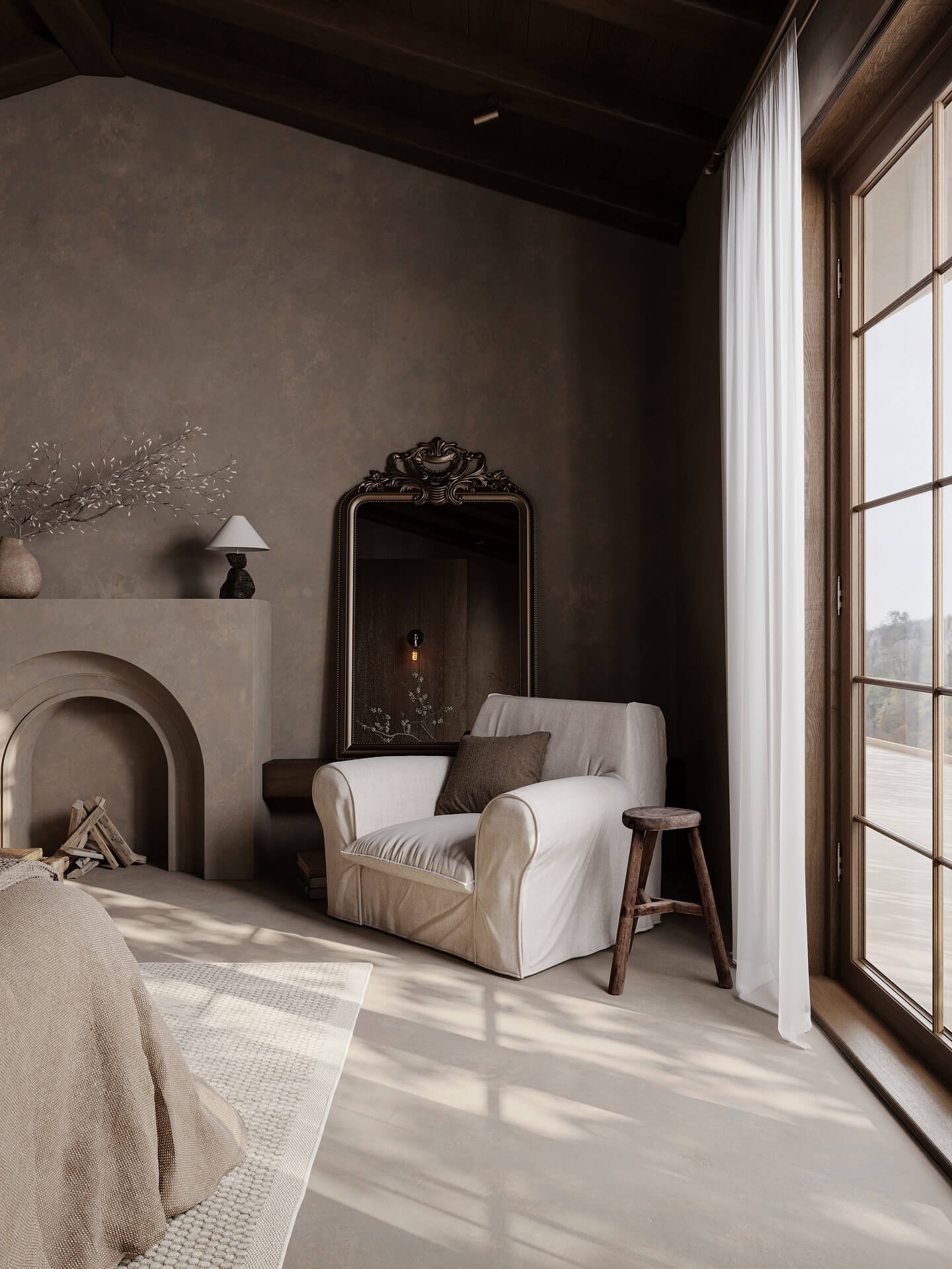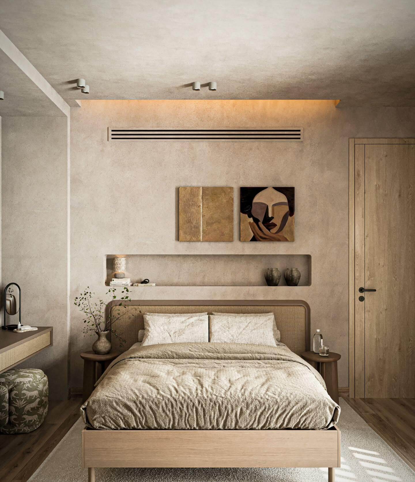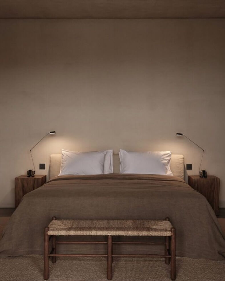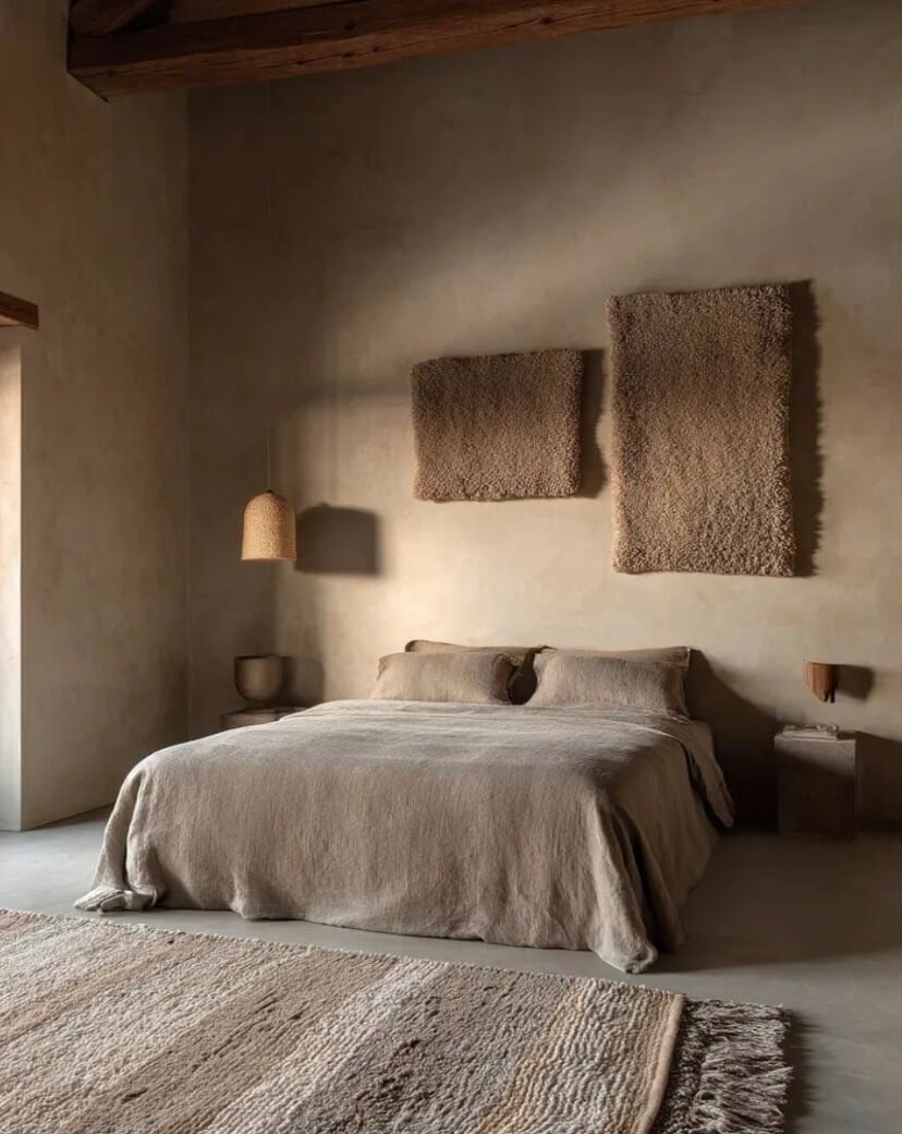 Choose warm neutrals: soft white, oat, greige, clay, and muted charcoal. Layer two to three tones across walls, bedding, and rugs for depth without visual clutter or contrast fatigue.