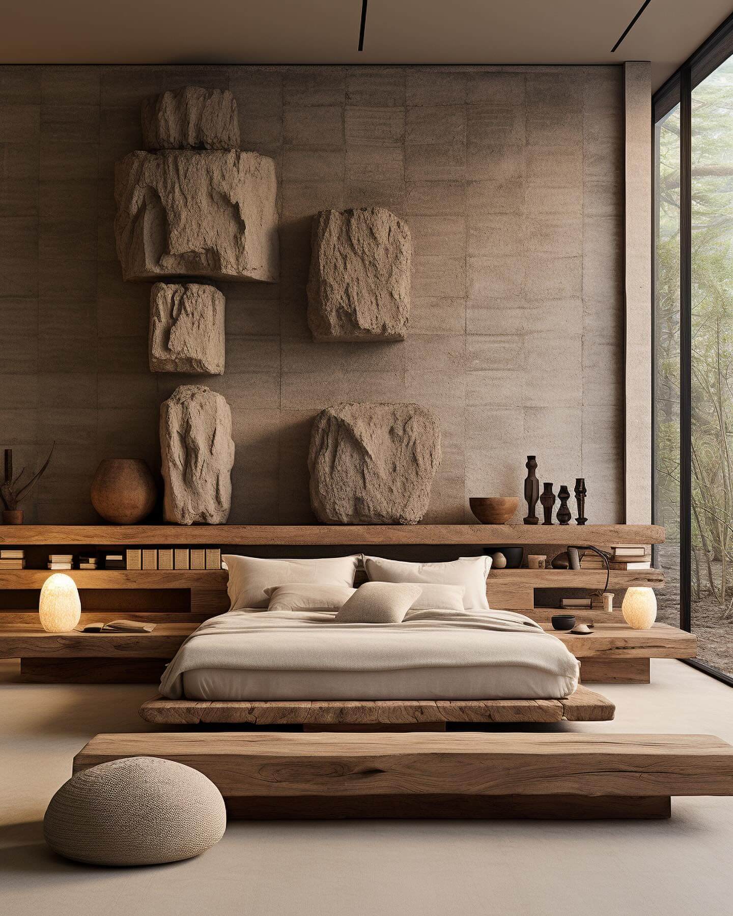 When wood sets the tone, stone steadying the space completes the picture. A petite travertine pedestal, tadelakt (Moroccan plaster) ledge, or honed limestone cube reads calm and elemental in a Japandi bedroom. These mineral surfaces introduce cool weight against warm timber, amplifying the Wabi-Sabi dialogue of contrast and harmony. Keep forms simple and edges softly eased; stone should feel quiet, not showy. Style sparingly: a tea cup, a linen-bound book, a ribbed carafe—useful objects with tactile presence. If you’re working with a small footprint, a built-in plaster shelf “nightstand” keeps the floor clear and sightlines open. Layer a rice-paper sconce above to wash stone with diffused light, and choose a low-color palette—beige travertine, chalky clay, ecru linen—so the materials do the talking. Over time, water rings and micro scuffs will tell a story; that evolving surface is the essence of Wabi-Sabi beauty and a subtle reminder to slow down.