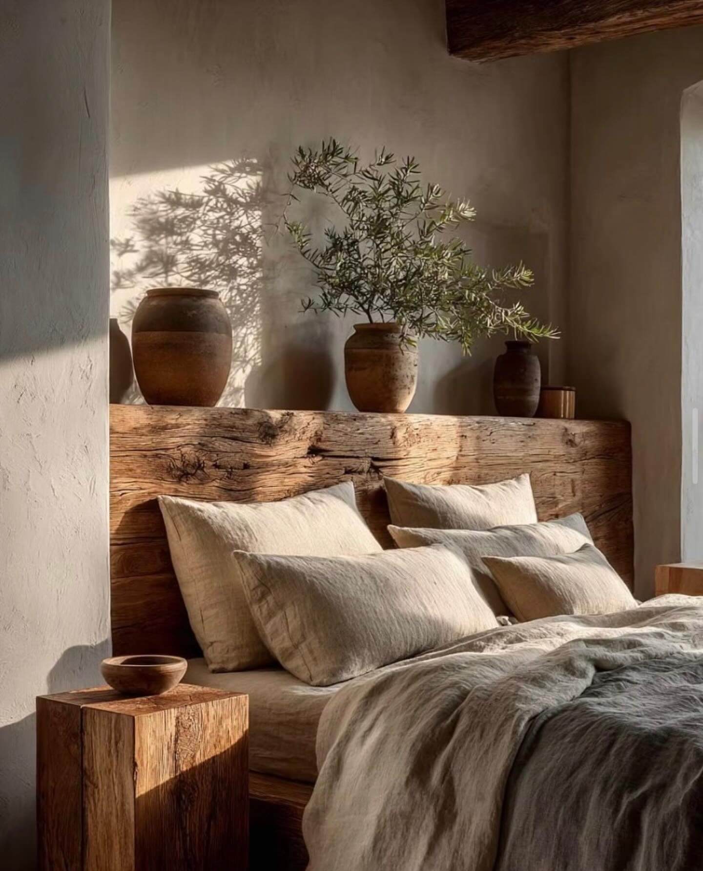 - A reclaimed wood headboard with visible knots, checks, and uneven edges adds storied character, anchoring the bed with tactile warmth that deepens over time.