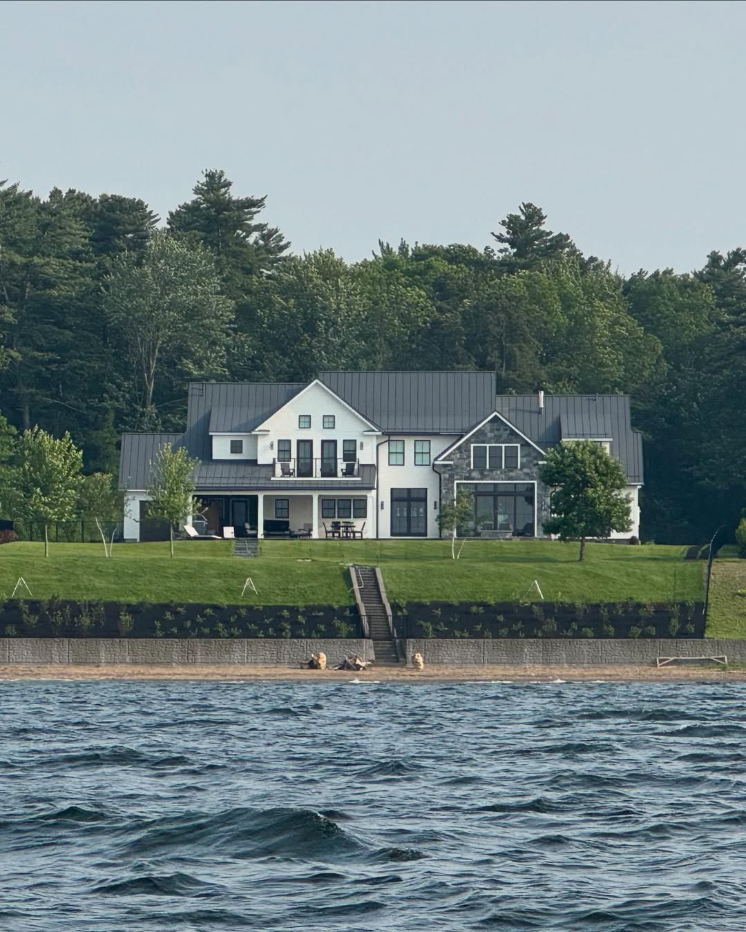 This lake house channels the essence of a traditional American estate while embracing all the luxuries of modern lakeside living. With its steep gabled rooflines, light-colored brick exterior, and multi-wing layout, the home feels expansive yet inviting—perfect for large families or multigenerational gatherings. The symmetry and neat landscaping lend a sense of order and calm that mirrors the peaceful lake setting beyond.