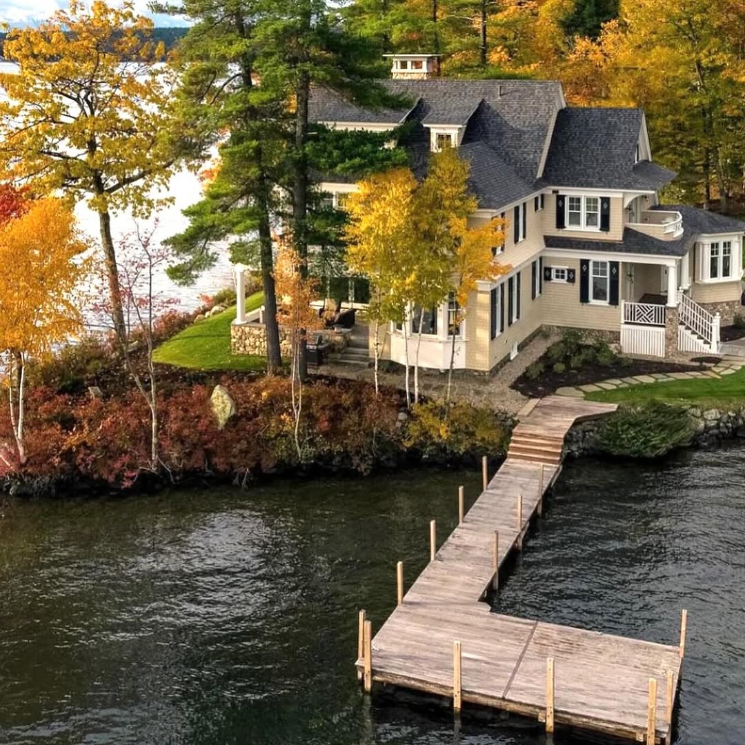Perched right at the water’s edge on its own mini peninsula, this lake house feels like it’s straight out of a storybook. Surrounded by vibrant autumn foliage and hugged by the lake on three sides, the home’s soft beige siding, crisp white trim, and dark shingle roof blend effortlessly with the natural surroundings. The charming architectural details—arched entryways, multiple balconies, and cozy porch spaces—add to its whimsical, cottage-like appeal.