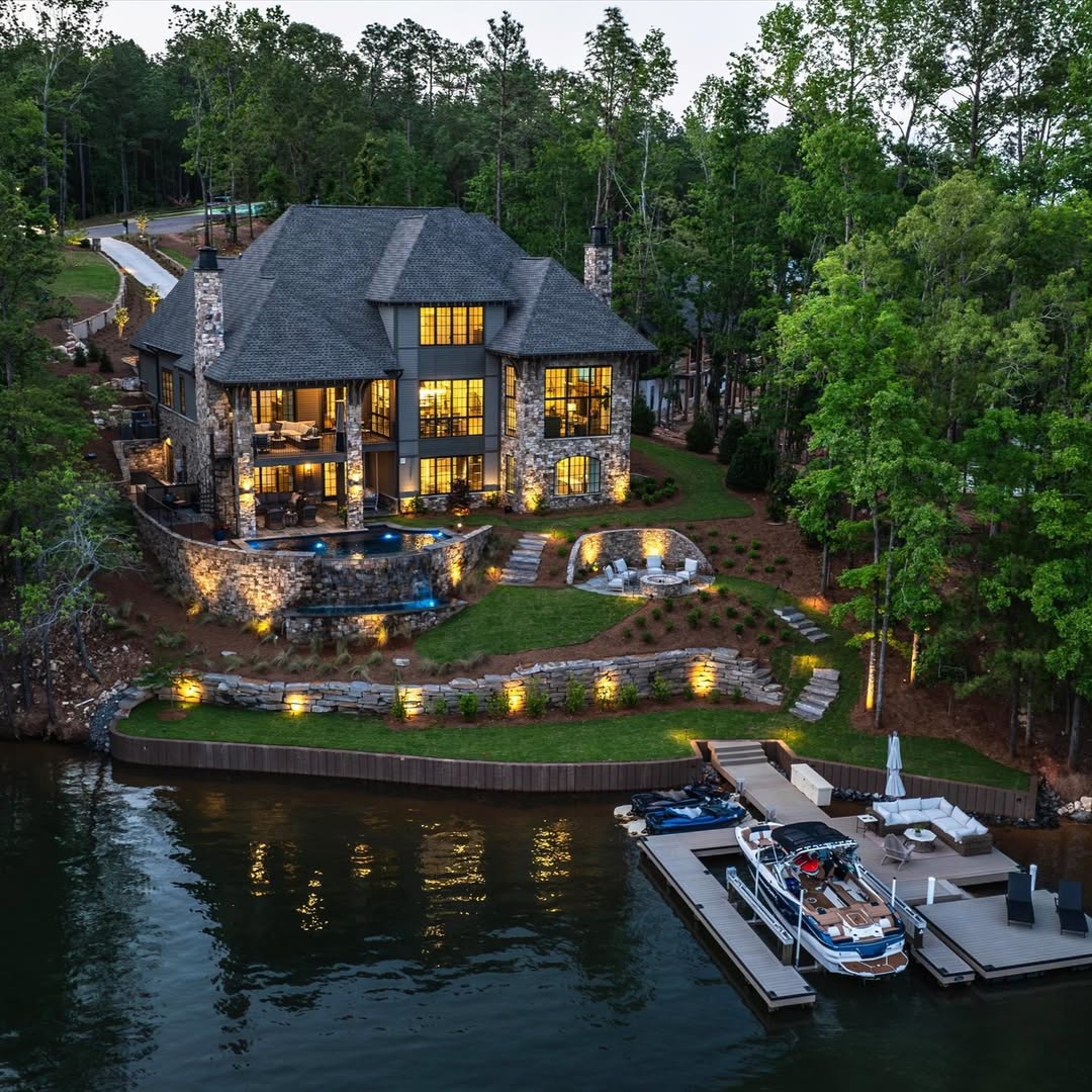 The lush lawn leads directly to the shoreline, where a custom dock extends into the lake, complete with Adirondack chairs and planters that add just the right touch of comfort and style. The stone path and soft exterior lighting create a gentle transition from house to dock, enhancing the peaceful, retreat-like ambiance.
