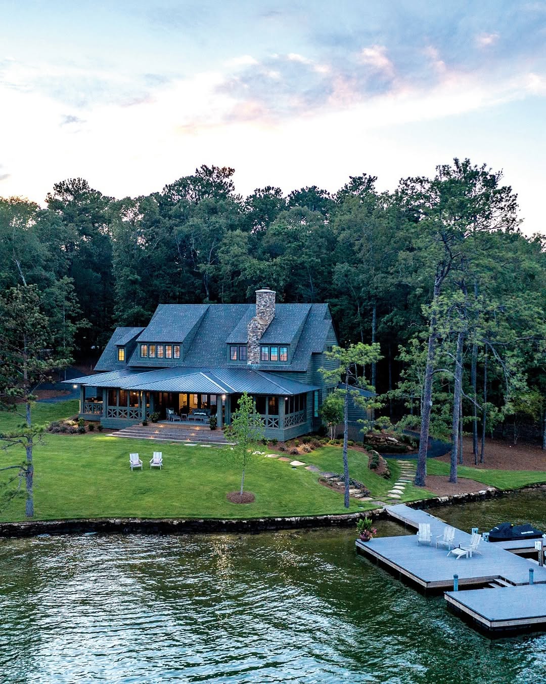 This enchanting lodge-style lake house is the epitome of lakeside serenity, with a design that feels both grounded and timeless. Set against a backdrop of mature trees, its dark, earthy exterior blends harmoniously with the natural environment. The steeply pitched rooflines and prominent stone chimney evoke the feel of a mountain retreat, while the sprawling wraparound porch invites long, slow evenings by the water.