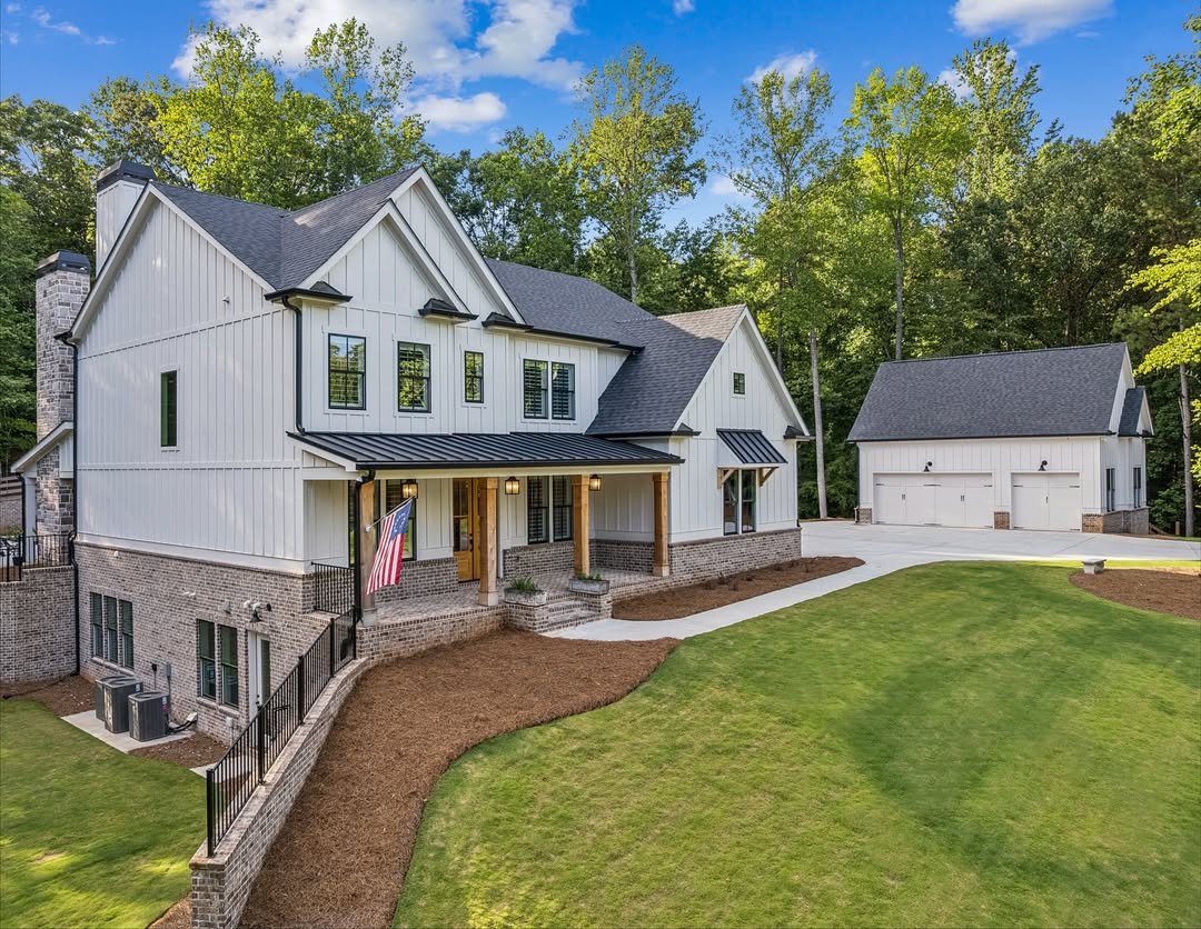 This striking modern farmhouse-style lake house makes an unforgettable impression with its crisp white facade, black metal roof, and expansive glass windows—all positioned perfectly to face the water. The architecture balances traditional charm with contemporary elegance, featuring clean lines, board-and-batten siding, and a symmetrical layout that feels both grand and inviting.