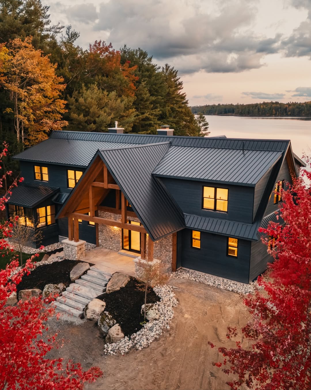 Nestled among tall pines and vibrant fall foliage, this lake house makes a powerful statement with its rich color palette and bold architectural elements. The exterior combines dark siding with a sleek black metal roof, giving it a modern edge, while exposed timber beams, natural stone, and large front gables ground the design in classic lodge-inspired style.
