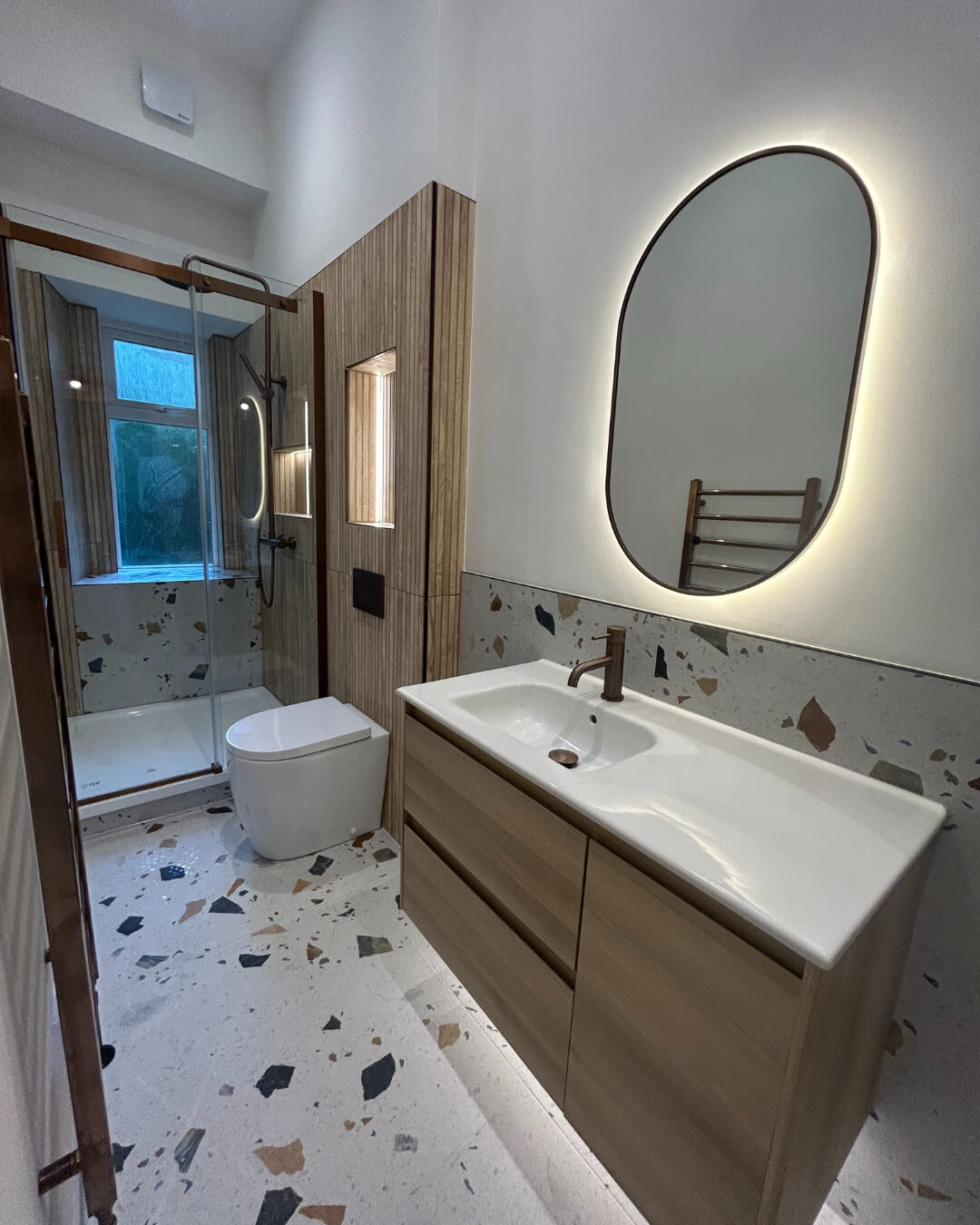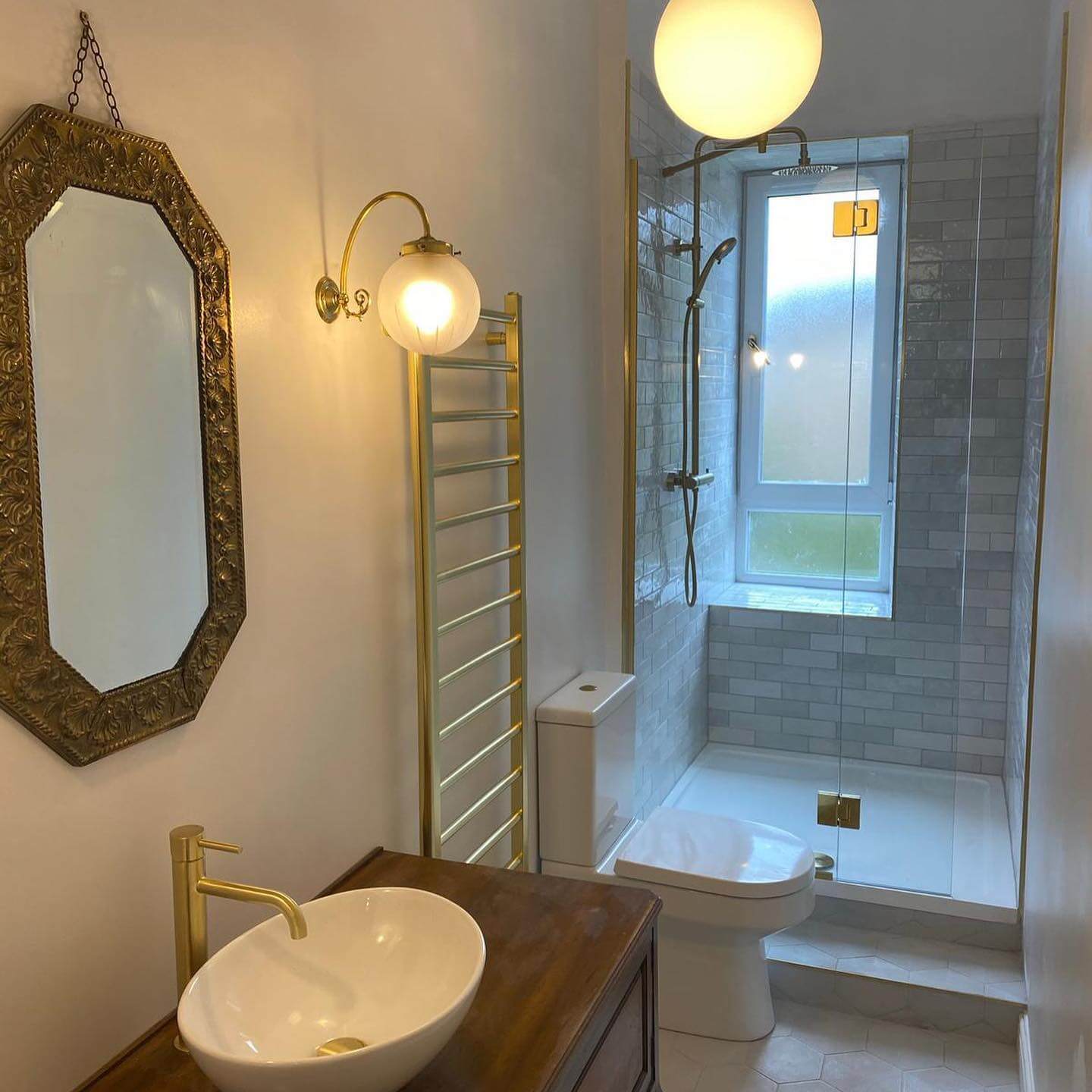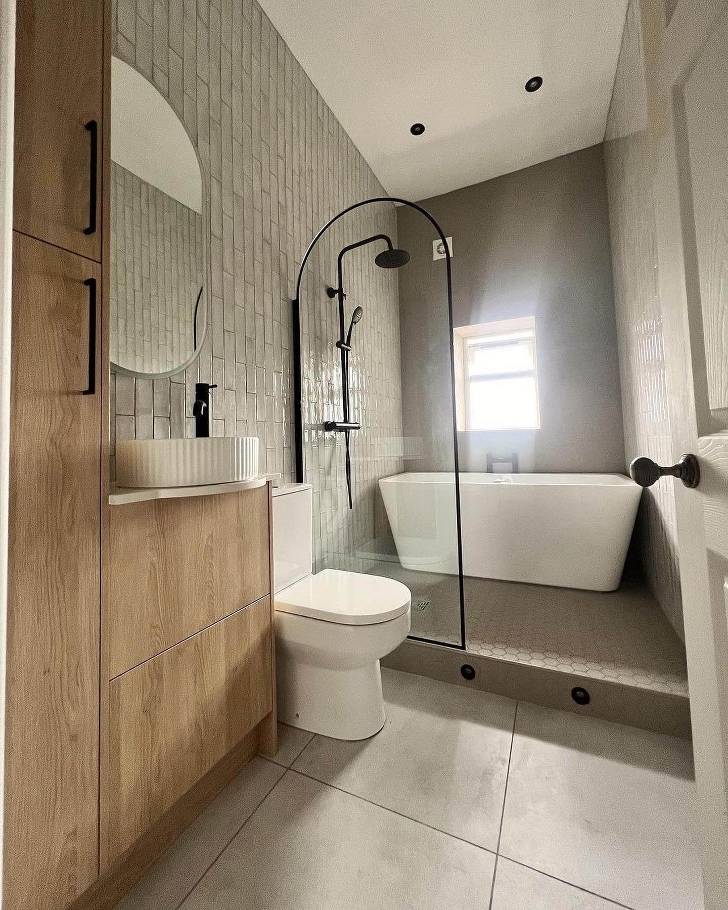 - Zoned wet room: Convert the whole back half into a tiled wet zone with glass, enabling a larger walk-in shower, linear drain, and easy cleaning without interrupting circulation.