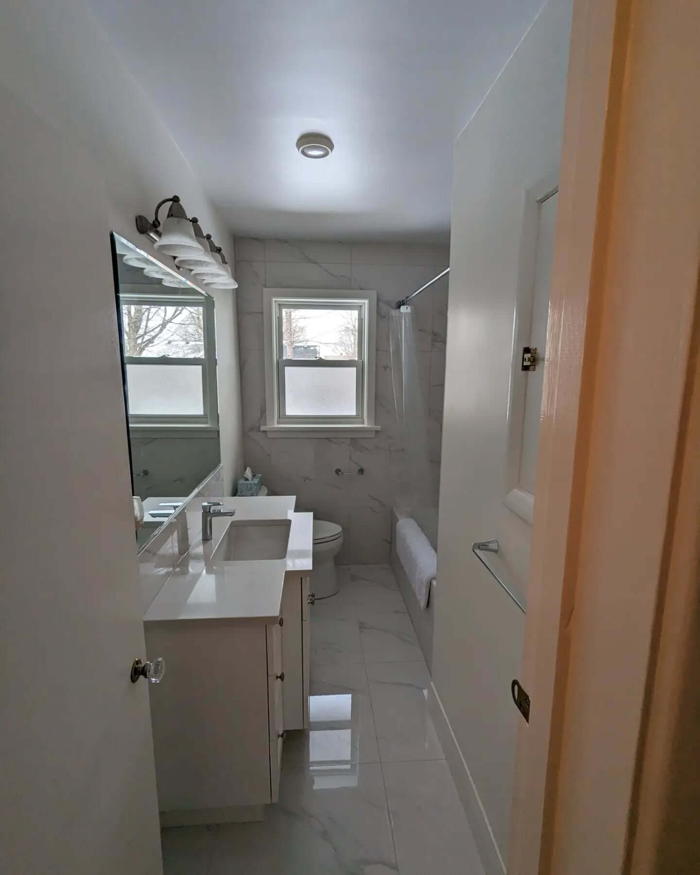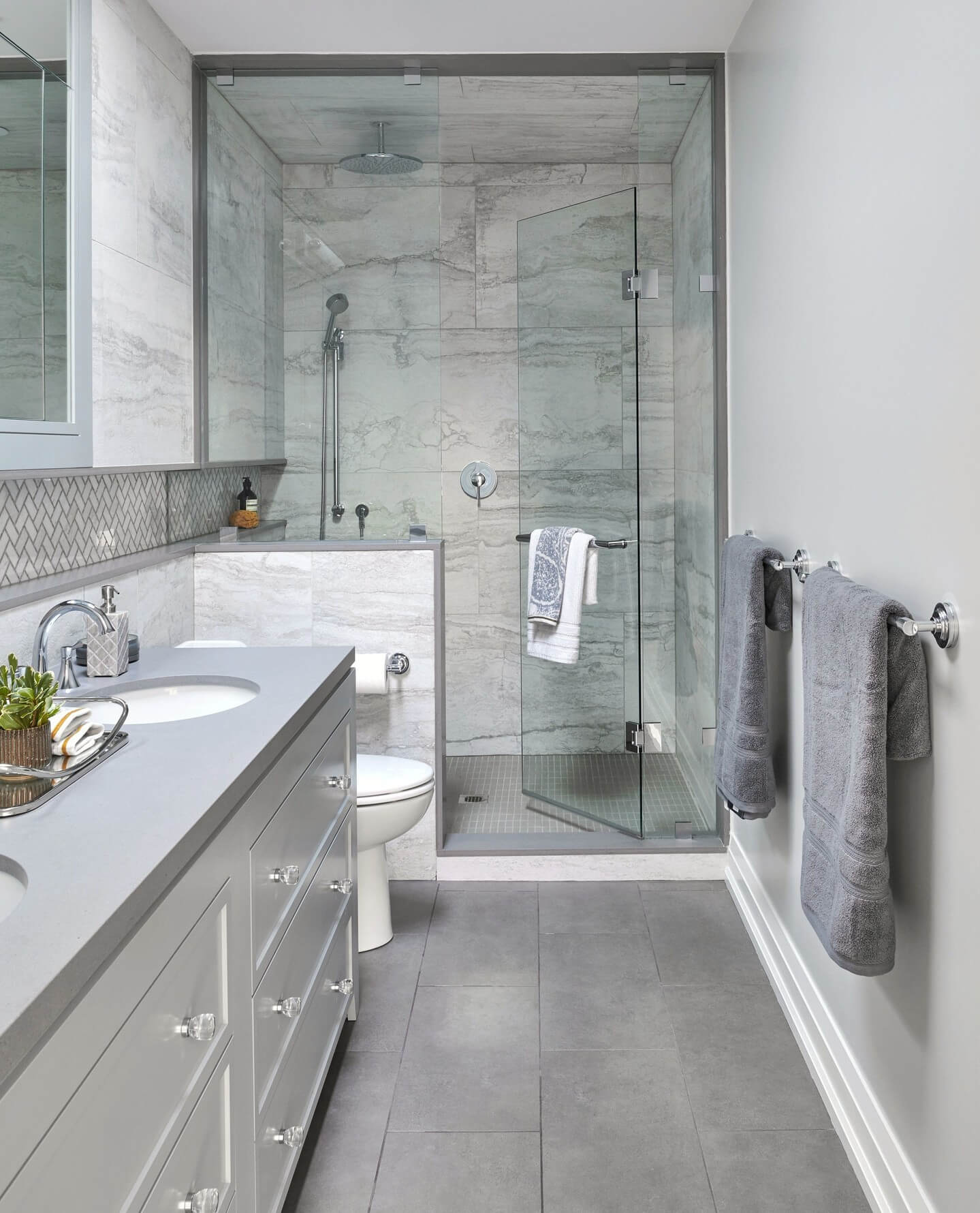 - Shower comfort: A 36-by-36-inch shower feels comfortable in slim rooms; use a linear drain to run tile planks lengthwise, avoid curbs, and keep water contained behind clear glass.