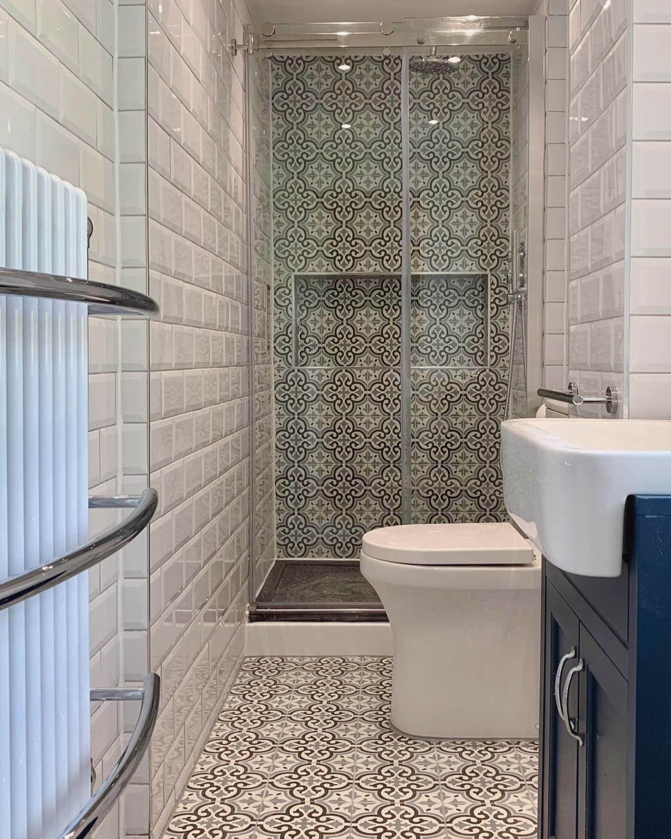 - Specify clear, frameless glass for the shower with minimal hardware, letting light pass through the narrowest section while showcasing patterned tile as a feature wall rather than a barrier.