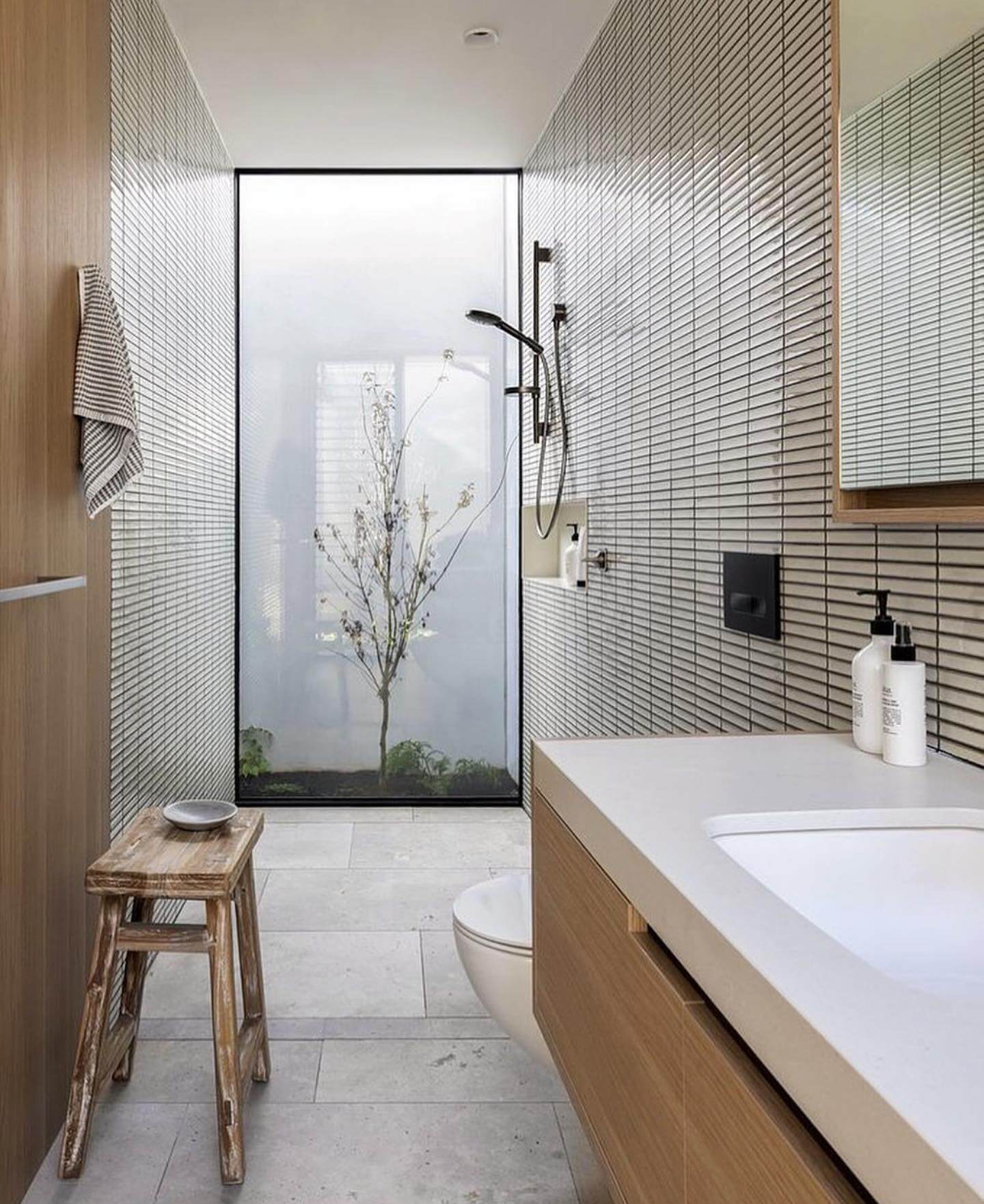 - Recess a mirrored medicine cabinet into studs and align it with a full-height niche in the shower, creating a clean datum line and unified storage rhythm from sink to stall.