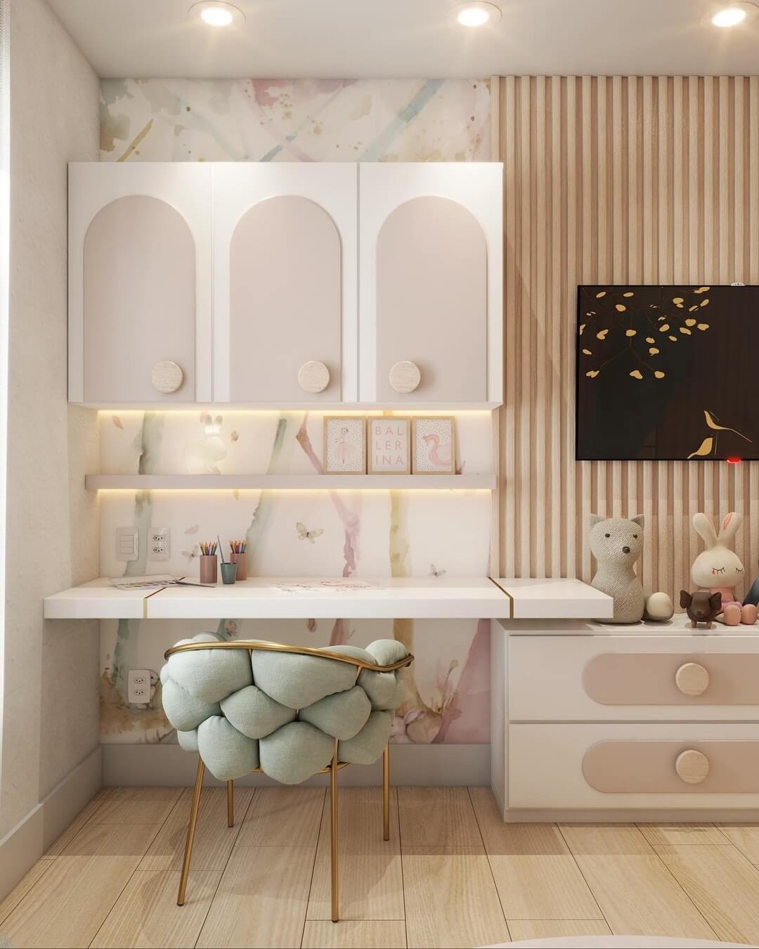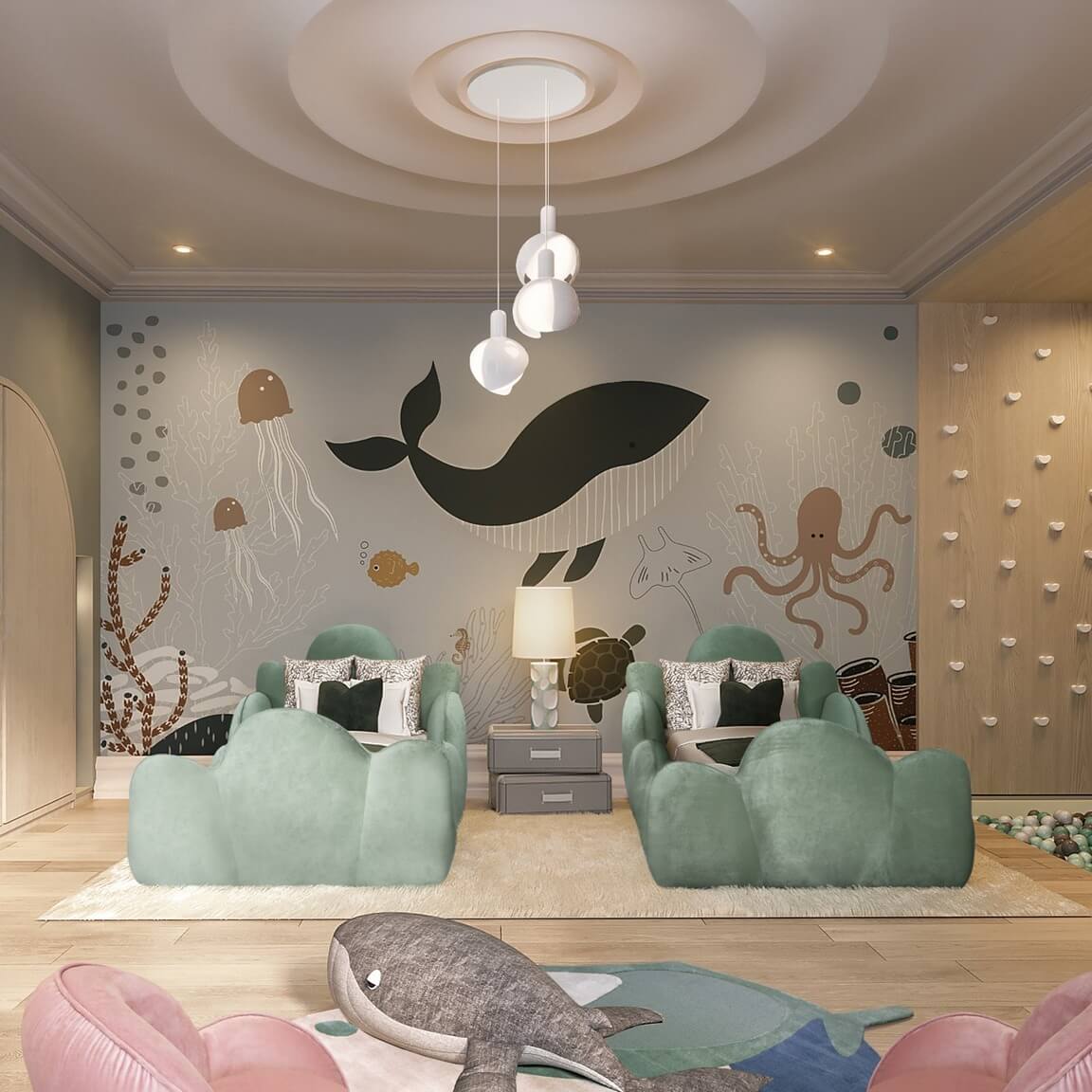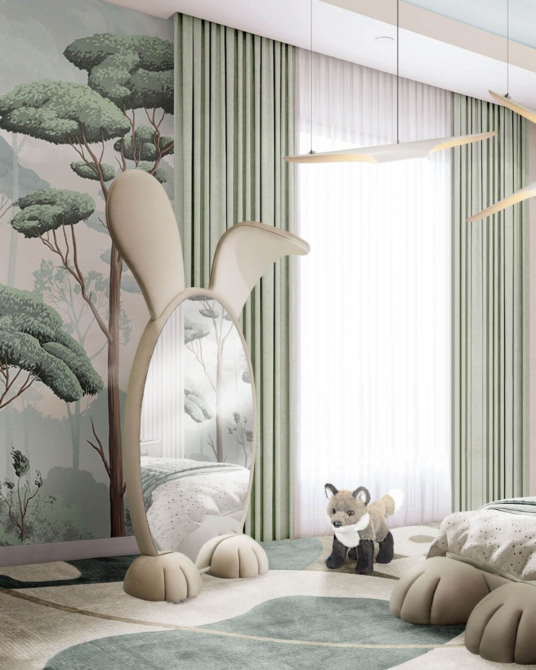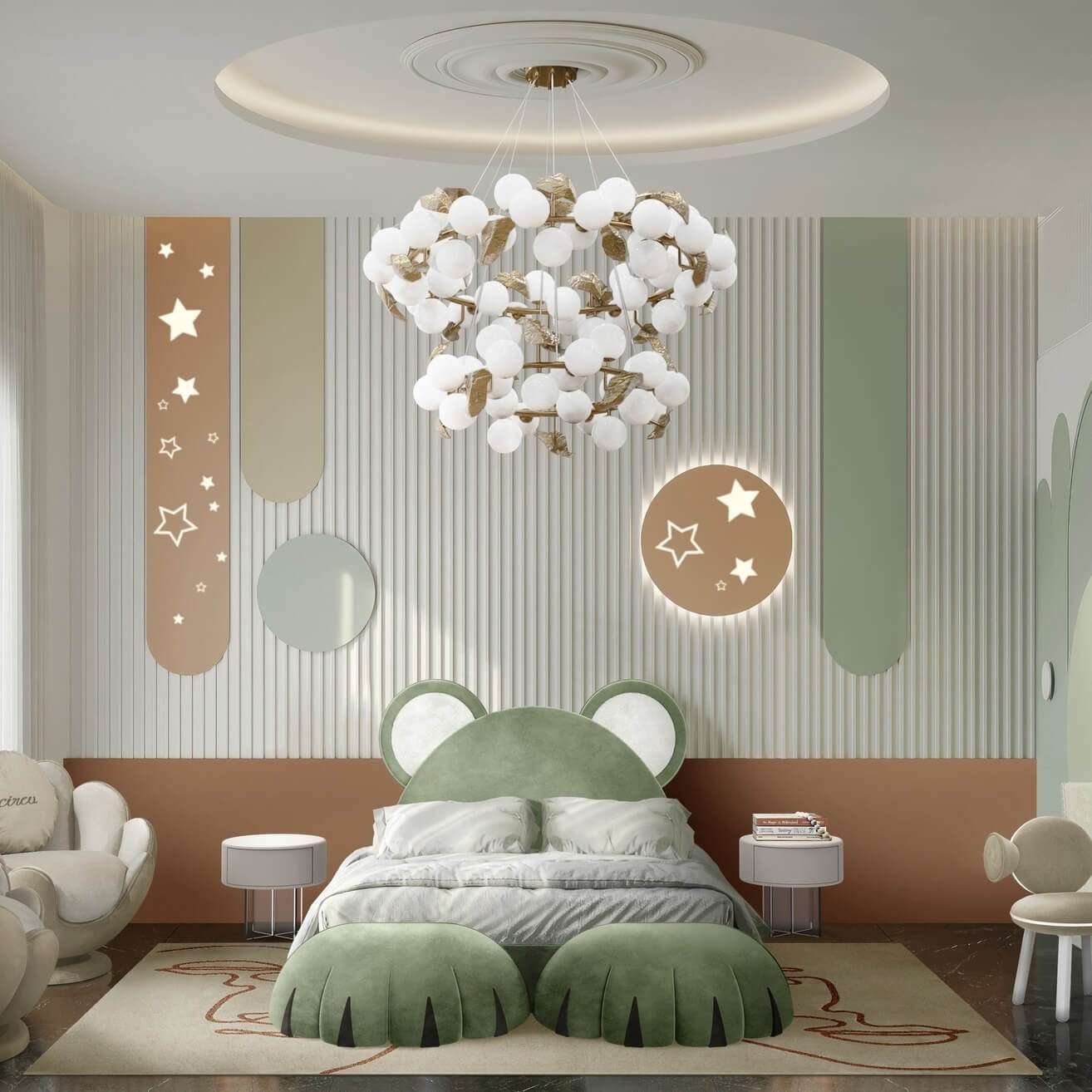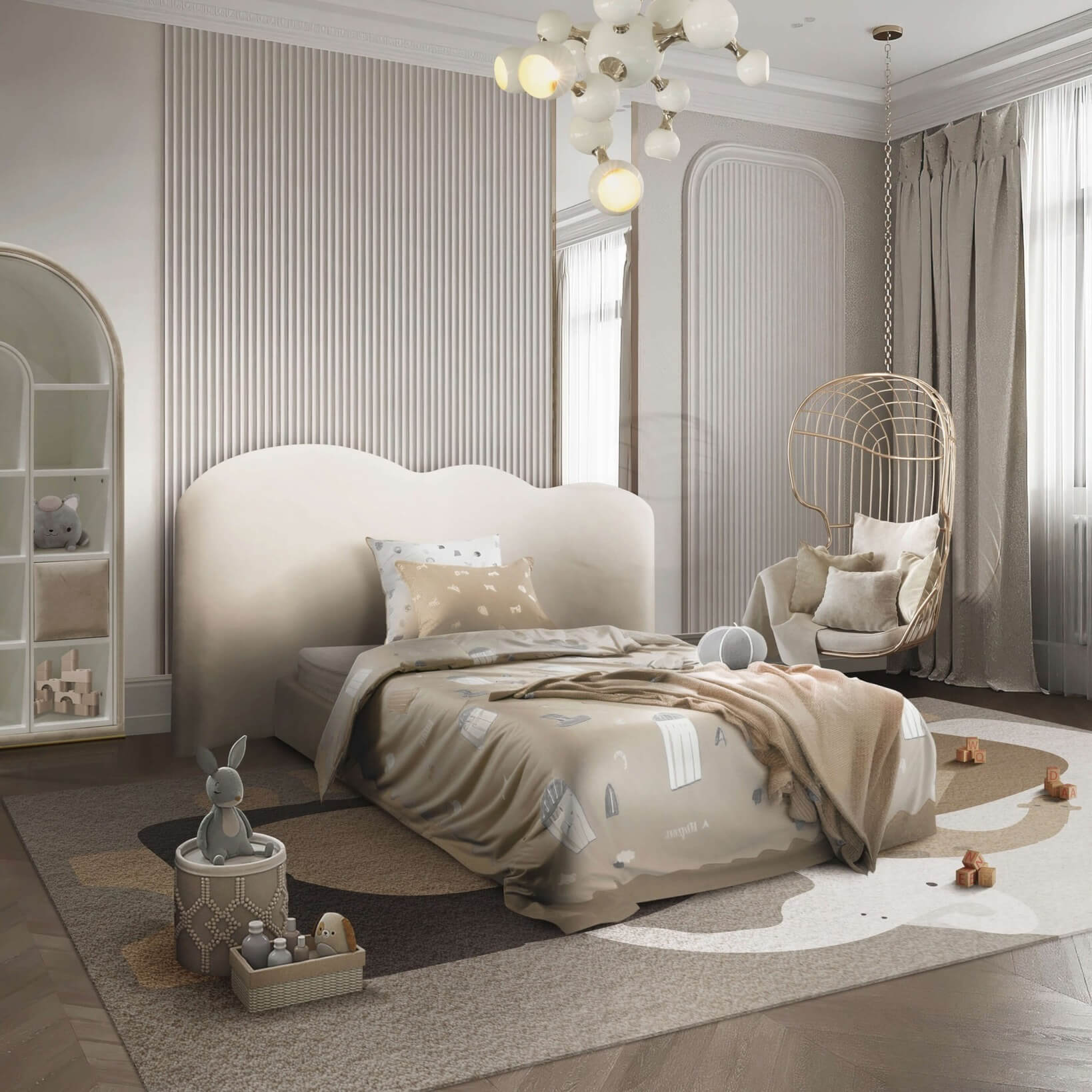 Curves are the quiet heroes of a luxury children’s room—visually soft, inherently safer, and timelessly chic. Specify rounded corners on desks and nightstands, arched headboard silhouettes, and scalloped valances or shelf fronts to introduce gentle rhythm. Built-in niches with radiused edges become cozy display moments for treasures and nightlights, while curved wardrobe handles or cane-inset doors add artisanal texture. Beyond aesthetics, softened millwork minimizes sharp-impact points for peace of mind. Keep finishes consistent: painted joinery in a velvety matte paired with natural oak or walnut for warmth, and aged brass hardware to tie everything together. A dome, globe, or flower-shaped pendant echoes the language overhead, and a wave-edge rug underscores the motif underfoot. This vocabulary of soft geometry plays beautifully with both tailored and whimsical themes, making it a smart foundation that transcends trends. The result is a room that feels cocooning yet elevated—proof that child-friendly and design-forward can be the same brief.