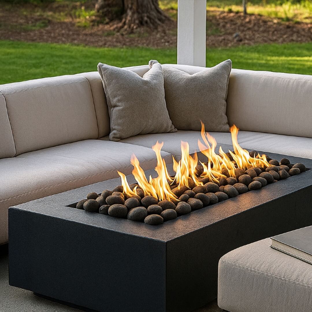 - Plan for maintenance: removable lava rock or fire glass, a fitted cover, and concealed storage for screens, cushions, and blankets to extend the season without visual clutter.