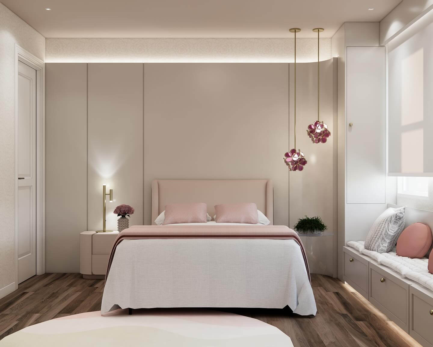Next, define your color story. A modern princess bedroom aesthetic leans into blush pink, lavender, and cream with soft gold or antique brass accents for warmth. Keep walls airy—think warm white or a whisper of pink—then layer color through textiles, art, and florals. For subtle whimsy, try a scalloped paint border, color-drenched trim, or a painted ceiling (the “fifth wall”) in a pale pastel that feels serene from bed. Two-tone walls with a chair rail or wainscoting add quiet structure and a boutique look. Metallics should be restrained—choose brushed brass curtain rods, a gilded mirror, or delicate picture frames rather than going all-in. If you want more drama, introduce one deeper accent (mauve, dusty rose, or plum) in small doses via pillows or a velvet throw. The goal: a layered pastel palette that feels sophisticated, not sugary, so the room grows gracefully from toddler to teen (and even adult sanctuary) without a full repaint.